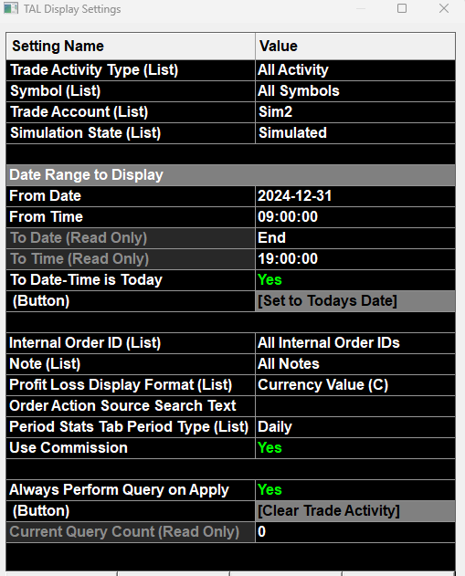 As long as you have the correct DisplaySettings, the information should be in there. Check the "Trade Account" and "To Date/Time" fields in particular to make sure they are set properly. If everything looks correct and you are still not seeing what you expect, then please get us an image of the DisplaySettings from the Trade Activity Log by following these instructions (note that the DisplaySettings window needs to be on top of the chart to capture it): Support Board Posting Information: Attaching or Posting a Screenshot/Image (Optional) For the most reliable, advanced, and zero cost futures order routing, use the Teton service: Sierra Chart Teton Futures Order Routing |