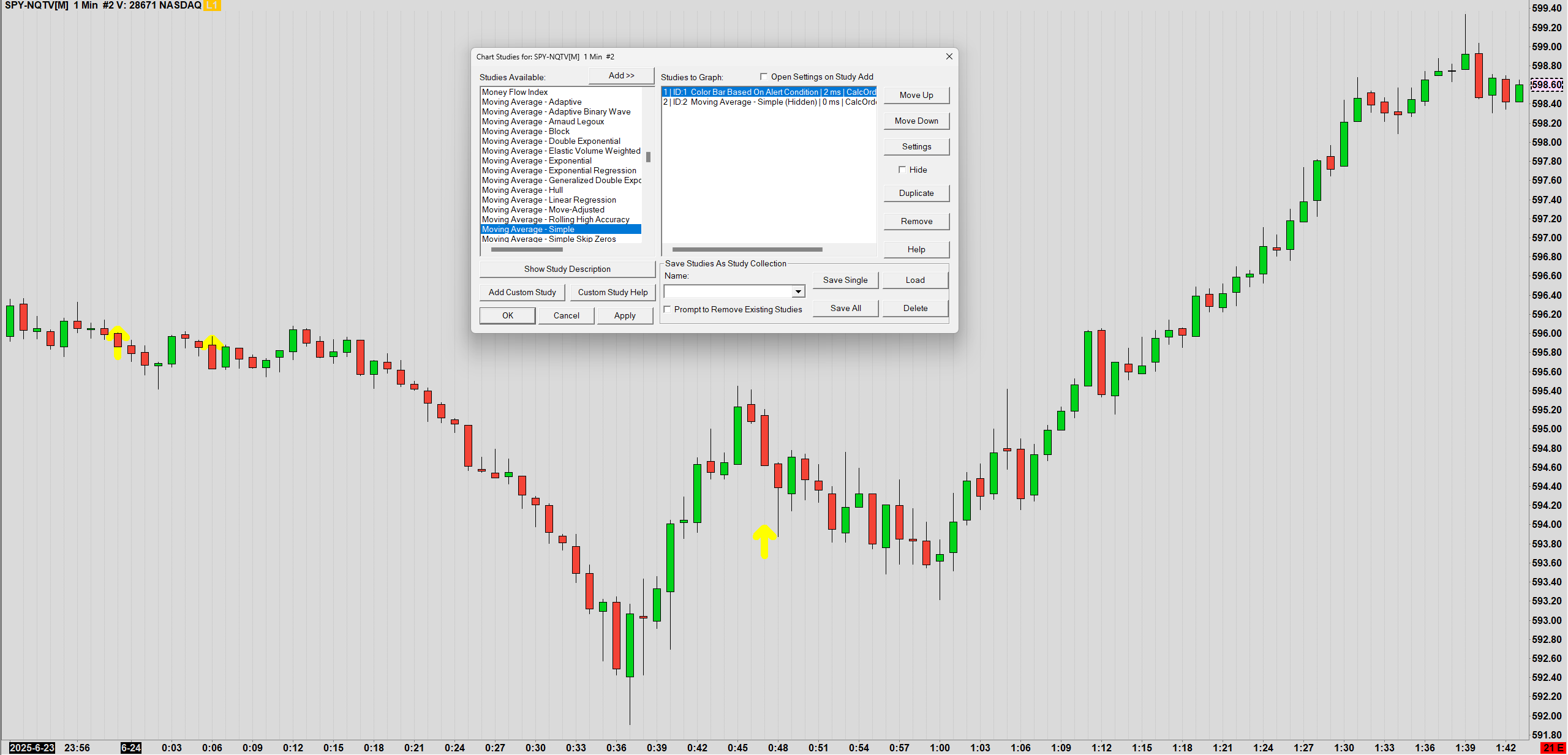 If you want to change the arrows to be a Point or the value at the top or bottom of the bar, then you can do this by changing the "Study/Price Overlay" Draw Style. Keep in mind that you first need to set the Input for "Use Styles and Widths from Source Study" to "No" and then select "Apply" prior to making the change to the "Draw Style". Refer to the following: Study/Price Overlay Study: Use Styles and Widths from Source Study Chart Studies: Point On Low (ACSIL: DRAWSTYLE_POINT_ON_LOW) If you are wanting to completely change what is viewed and where, then you would need to use another "Color Bar Based on Alert Condition" on the chart that has the "Study/Price Overlay" on it. The formula you wrote should work, although you can just use =ID1.SG1. Then setup that Color Bar Based on Alert Condition as you want. The one "trick" to this is that you have to ensure that the "Color Bar Based on Alert Condition" is below the "Study/Price Overlay" in the list of studies to graph - as this controls the order in which the items are calculated. Refer to the following: Chart Studies: Study Calculation Precedence And Related Issues For the most reliable, advanced, and zero cost futures order routing, use the Teton service: Sierra Chart Teton Futures Order Routing |