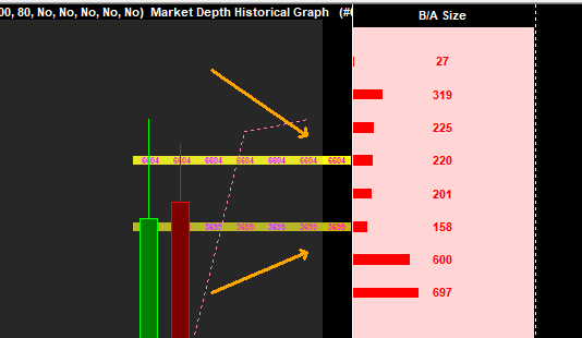 Can you explain why I am seeing two different numbers here? The bar numbers represent "ASK Size" and is part of the "DOM Columns". I am assuming that this number, and its associated bar, represents all the limit ask volume (resting orders) at this price level. The yellow bar and pink numbers are from the study "Market Depth Historical Graph" and I assume represents all the limit ask volume (resting orders) at this price level that are active at the time indicated by the x-axis. Thus, shouldn't these two numbers be equal, assuming that the resting orders represented by the "Market Depth Historical Graph" study are currently active (have not been pulled)? Instead the "Market Depth Historical Graph" is showing "6604" and the "Ask Size" is showing only "220"? Likewise, the second yellow bar shows "3699" but the "Ask Size" is "158". Thx |