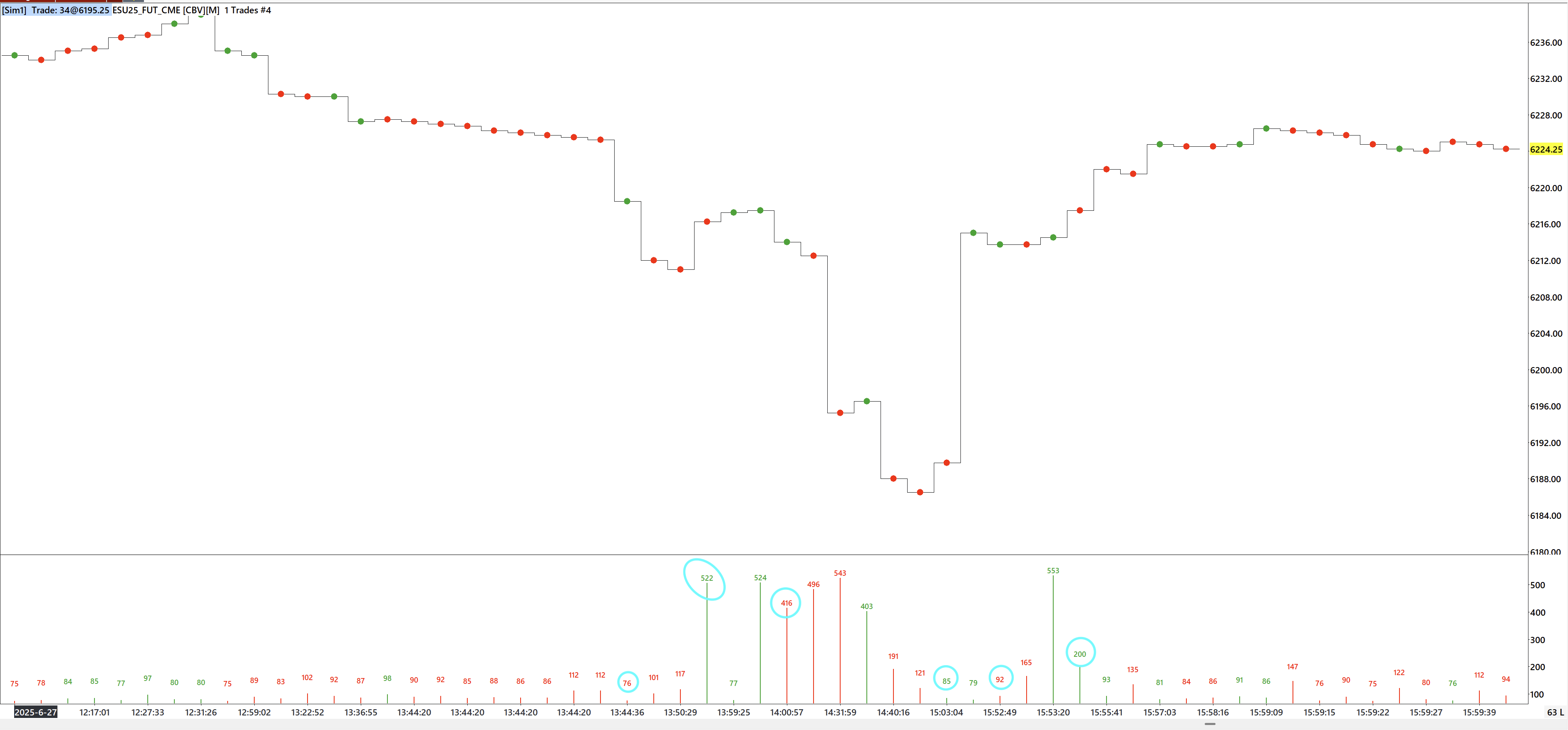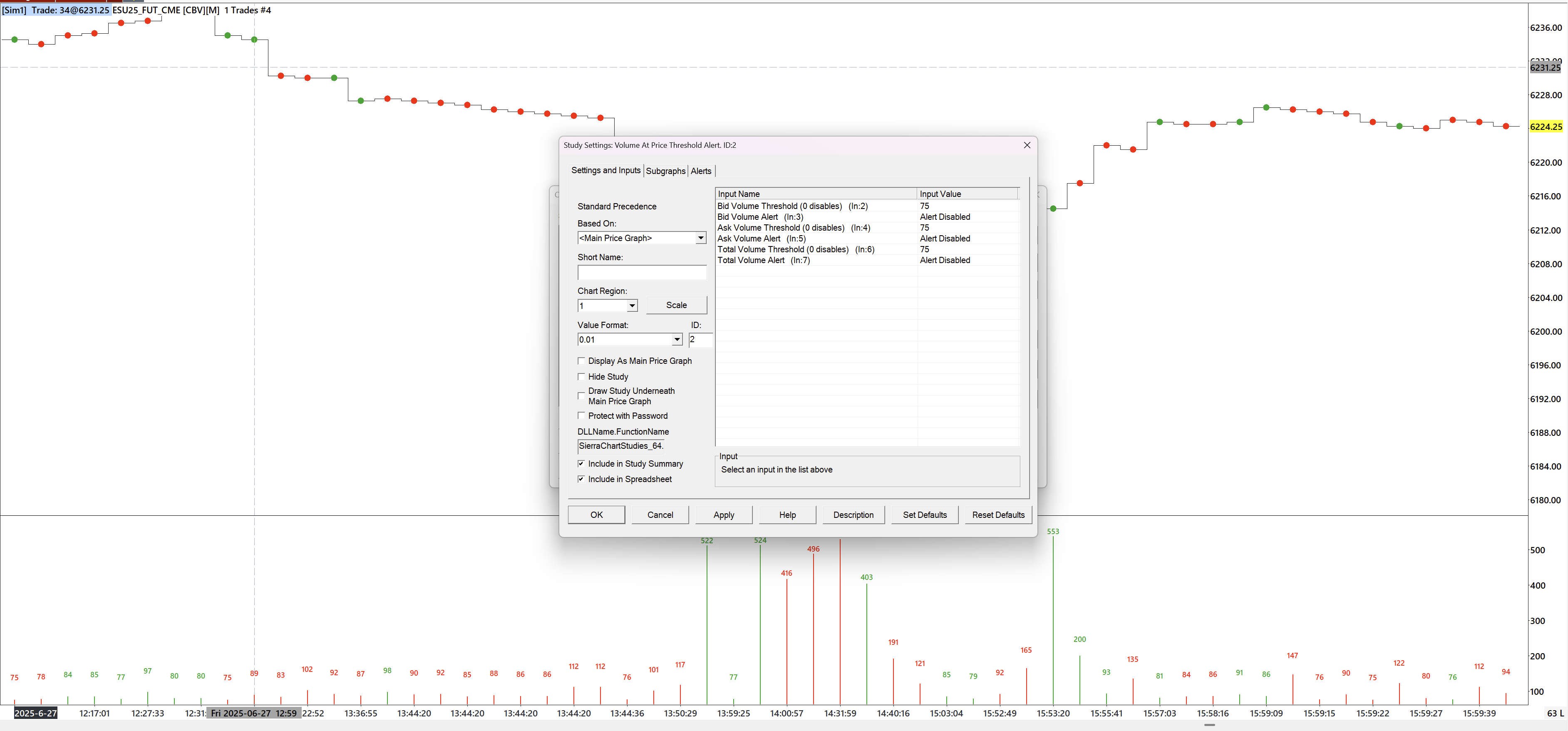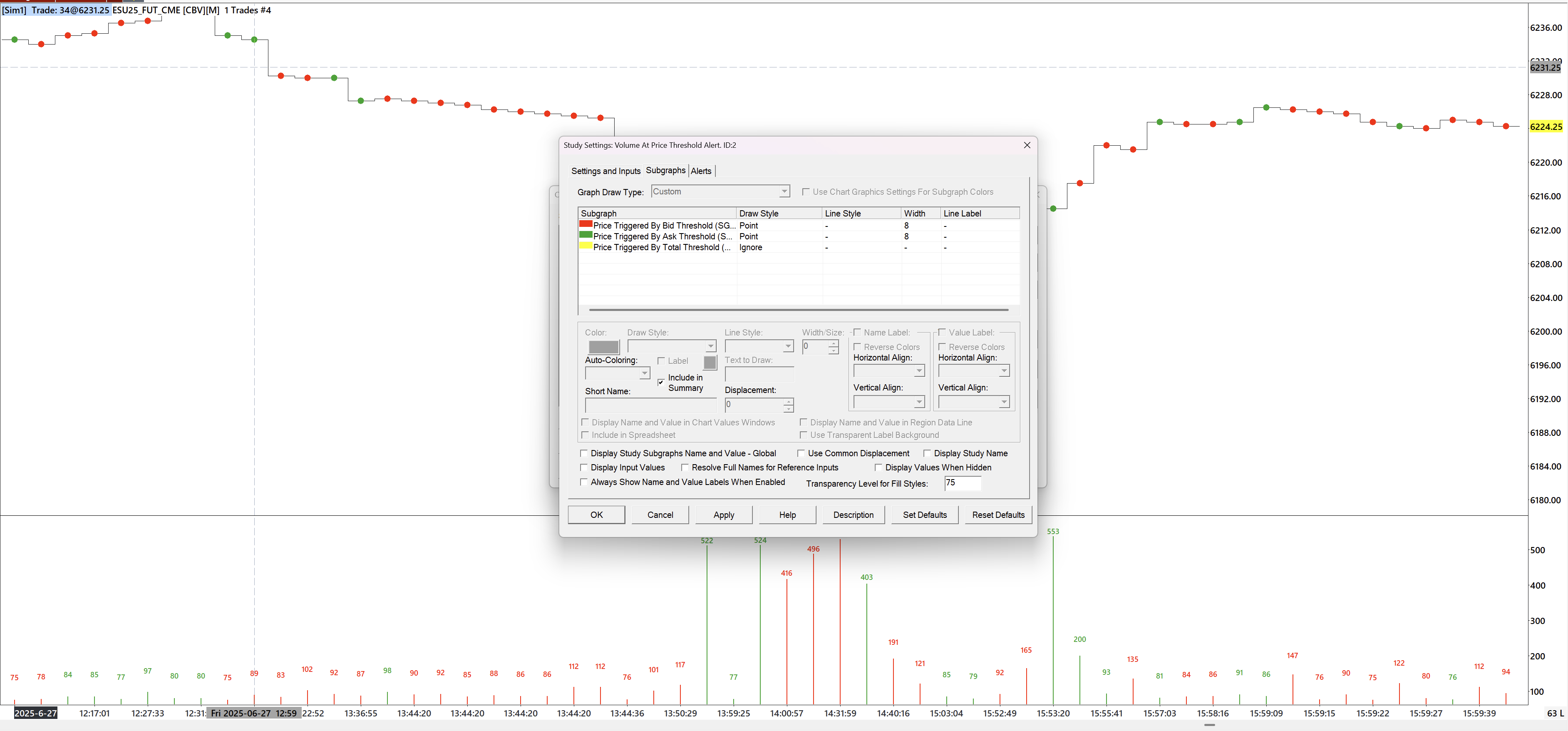 I have the following settings on my chart: Bar Period Type: Number of Trades Per Bar Bar Period Value: 1 Graph Draw Type: Stair Step on Close Volume Filter Settings: Exclude <= 74, Filter Trade Completely: Yes I have the following studies on my chart: Volume - This study uses Draw Style: Bar to display volume bars Volume - This is a duplicate but Draw Style is set to: Custom Value at Y, to display the volume size above the volume bar Volume At Price Threshold Alert - Bid Volume Threshold: 75, Ask Volume Threshold: 75, Total Volume Threshold: 75. I have set the Draw Style for Bid and Ask to Point, width 8. Draw Style for Total is Ignore As you can see in the screenshot where I have drawn blue circles, there are quite a few instances where the color of the Point does not match the corresponding Volume Bar color. Why is this happening? They obviously should be the same color because the colors are supposed to correspond to whether the trade is on the bid or ask. Should I trust the “Volume” study colors or the “Volume At Price Threshold Alert” study colors as the correct version? Date Time Of Last Edit: 2025-07-01 07:08:41