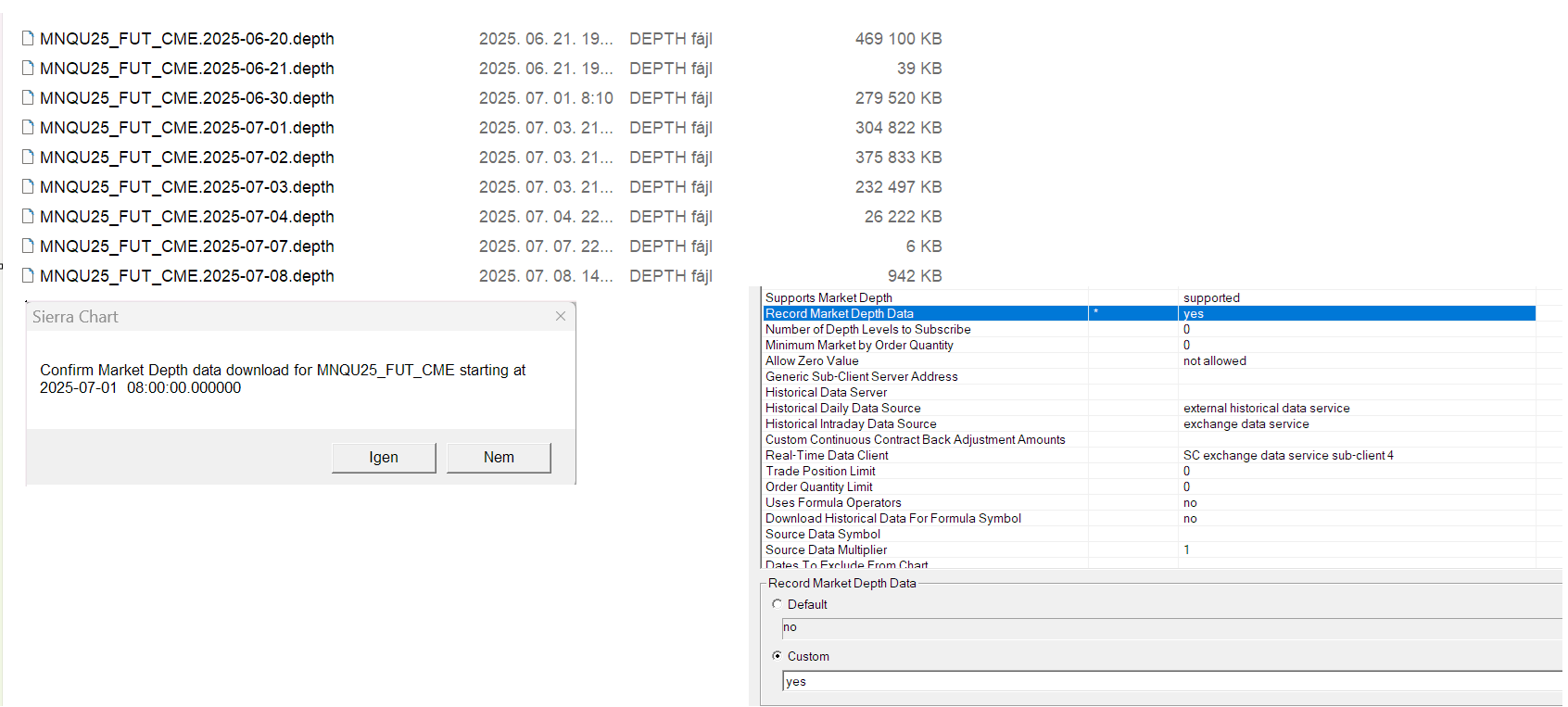 There is no issue with the historical market depth data for July 1, 2025 for the MNQU25 symbol. Make sure you have gone through the items we mentioned previously and then try to force a download of missing data by following the instructions at Step #8 at the following link: Market Depth Historical Graph: Downloading Of Historical Market Depth Data For the most reliable, advanced, and zero cost futures order routing, use the Teton service: Sierra Chart Teton Futures Order Routing |