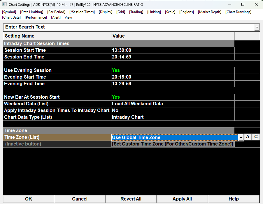 Hey so every time I open new intraday chart it has the same standard settings: global time zone, ugly OHLC bars, intraday chart session times that are weird, etc. How do i set my own settings so that every time I open a new intraday chart, it has my specified custom graphic settings, session time settings, time zone settings, etc? |