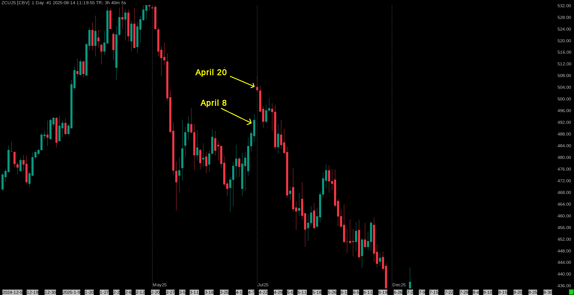 We adjusted the rollover rules for this ZC symbol. Follow the instructions here to re-download the data for all contract months: Continuous Futures Contract Charts: Re-Downloading Continuous Futures Contract Data Sierra Chart Support - Engineering Level Your definitive source for support. Other responses are from users. Try to keep your questions brief and to the point. Be aware of support policy: https://www.sierrachart.com/index.php?l=PostingInformation.php#GeneralInformation For the most reliable, advanced, and zero cost futures order routing, use the Teton service: Sierra Chart Teton Futures Order Routing |