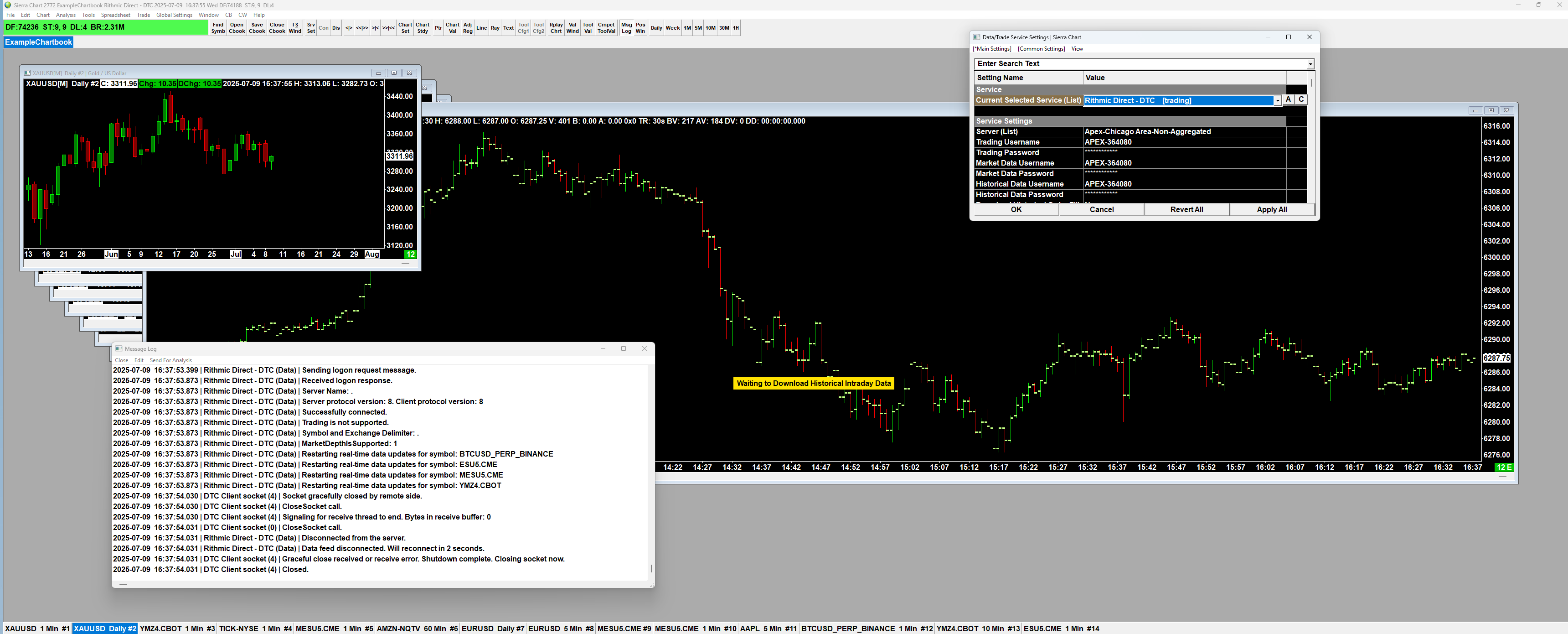 Hi Sierra Chart Support, My name is Yanir, and I’m reaching out for support regarding an ongoing issue I’m experiencing when trying to use Sierra Chart with my Apex Trader Funding account via Rithmic. The Problem Although I’m able to connect successfully to the Rithmic server (connection confirmed both by Apex and visible in Sierra Chart's message logs), I keep getting repetitive disconnections specifically related to CME data. The platform briefly completes the data download with a green message, but immediately restarts the "Downloading Historical Intraday Data" process. This loop prevents any stable visualization of charts and makes trading impossible. Additional Context ✅ I’ve purchased Package 11 and signed all the required agreements for CME data in the user portal. ✅ My Rithmic account is valid, and CME entitlements are enabled, as confirmed by Apex support. ✅ I’m not located in a restricted or banned country (I’m based in Israel). ✅ I’ve selected "Apex" under System Settings in Sierra Chart and not "Rithmic Paper Trading". ✅ I’ve allowed SierraChart_64.exe through both Public and Private firewall settings. ✅ I’ve installed and used Rithmic Trader Pro, confirming my credentials work. ❗ The issue only affects CME data — other symbols from different exchanges load and update correctly. Request Could you please help me understand what might be causing this CME-specific data loop and what steps I can take to resolve it? If required, I can provide: Message Logs Screenshots A full summary of my Data/Trade Service Settings Thank you very much for your support. I really hope to resolve this soon so I can continue the Apex evaluation process. Best regards, Yanir Baranovski |