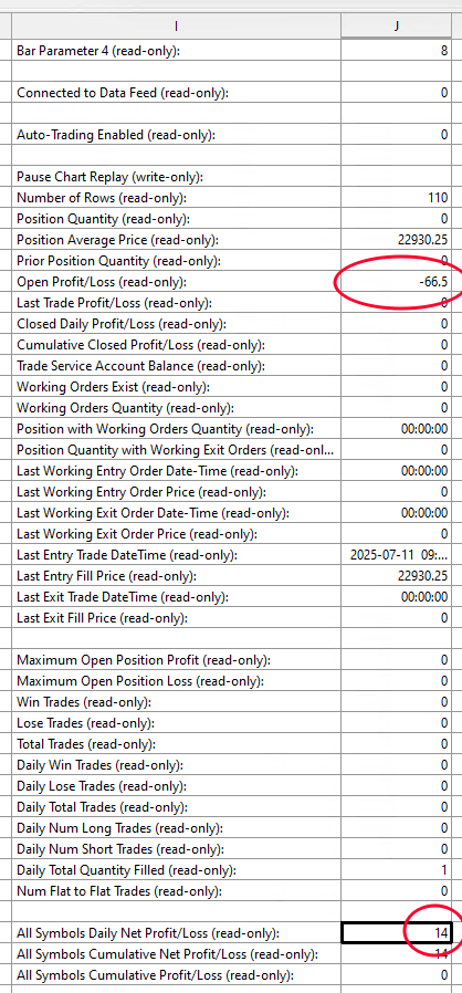 I'm trying to setup spreadsheet alerts based on "all symbols daily net profit/loss", field J65 with v2 J data enabled. I cleared all sim data/trades (trade activity log shows empty). Then I did 1 sim trade on a replay of around 9:35am Friday on a single chart. J65 shows 14. I don't know where the 14 comes from at all. J34 open Profit/Loss shows the correct -66.5. I want to reliably reference 1 field that provides the current open+closed net P/L for all tickers in the current account. (Setting up these alerts would be easier for users if incorporated into the global profit loss management. I just want audio alerts when the open+closed net p/l for all tickers is over, or under, account profit/loss values) |