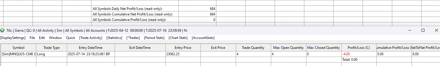 Related, I enabled P/L management, and this just happened in sim, but the logs don't match the p/l at all. It's not even say 10x like mnq/nq are mixed up. I can't see where this is coming from: 2025-07-15 12:42:49.679 | Profit management: Max Profit Reached for Daily Net P/L = 684.00. Trail triggered. Profit Value After Trigger to Flatten Positions is increased to 580.00. | Symbol: (unset) | TradeAccount: Sim1 2025-07-15 12:42:49.679 | Profit management: Daily Net P/L = 0.50. Profit value of 580.00 after initial trigger of 200.00, has been met. Flattening all Positions now. | Symbol: (unset) | TradeAccount: Sim1 2025-07-15 12:42:49.679 | Canceling orders for MNQU25-CME and trade account Sim1 for Flatten Position operation. | Symbol: MNQU25-CME | TradeAccount: Sim1 2025-07-15 12:42:49.679 | Profit/Loss management: Trading is now locked for 10m for trade account Sim1. | Symbol: (unset) | TradeAccount: Sim1 |