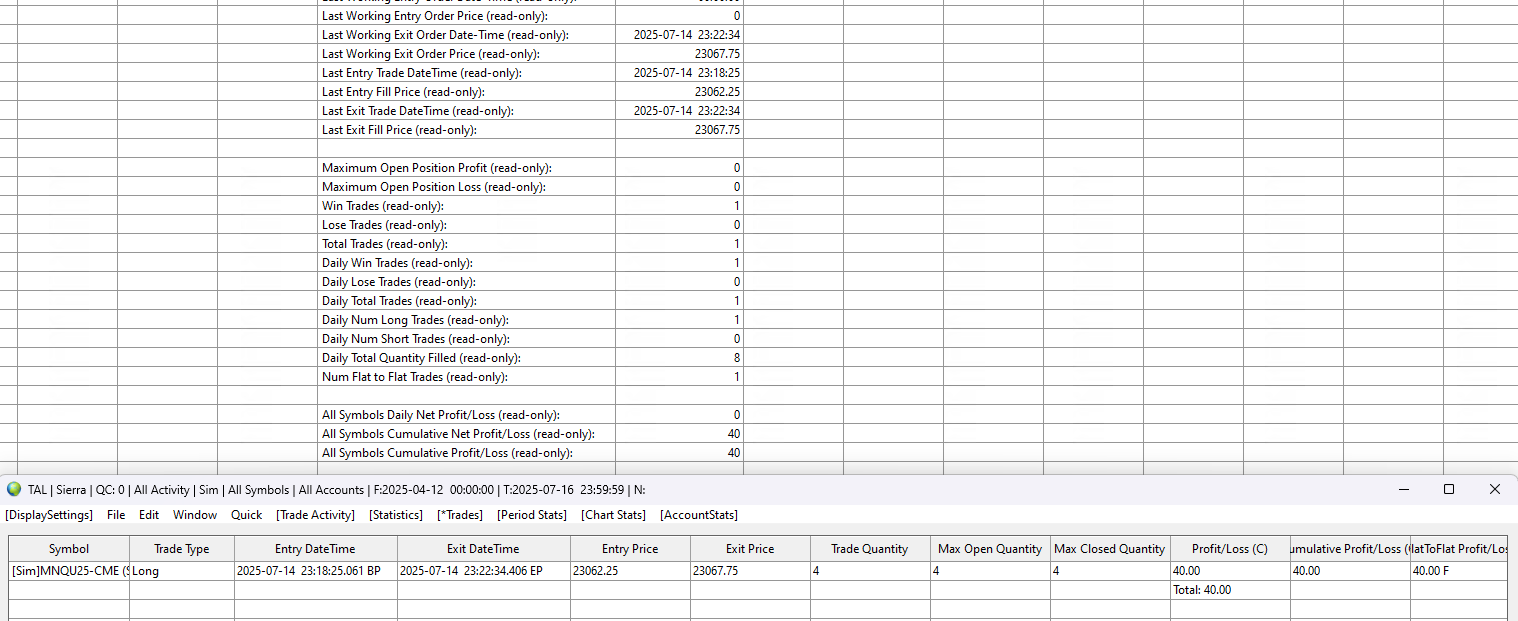 I didn't think it should. After more testing, I agree P/L Management and the Spreadsheet are not related, but there is still something going on. It looks like this is only happening in replay mode (set to single chart, or charts with same link number). I have a linked chart for MNQ. I have cleared all sim orders and trade data, and set the TAL to current day. TAL Chart Stats and Trades are empty. I enter 1 MNQ short at current price with the replay paused. P/L on the toolbar of the chart I'm trading shows -0.50C. TAL chart stats Open P/L for this chart shows -0.50. TAL chart stats Open P/L for the linked chart of the same ticker shows 144.50. I must of missed clearing something, somewhere? Date Time Of Last Edit: 2025-07-16 16:34:00