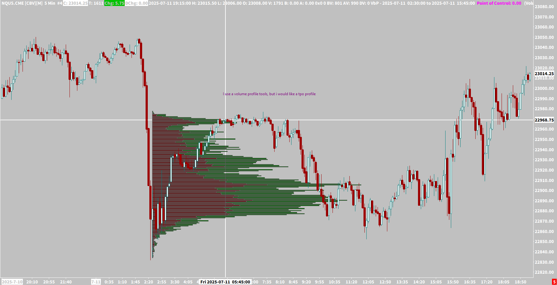 Bonjour Mme Mr j'aimerais pouvoir créer un profile TPO comme l'outils profil de volume. Pour pouvoir tracer un tpo sur un graphique. Au lieu d'avoir un profile de volume j'aimerais avoir un profil TPO. merci d'avance https://www.sierrachart.com/image.php?Image=1752338317537.png |