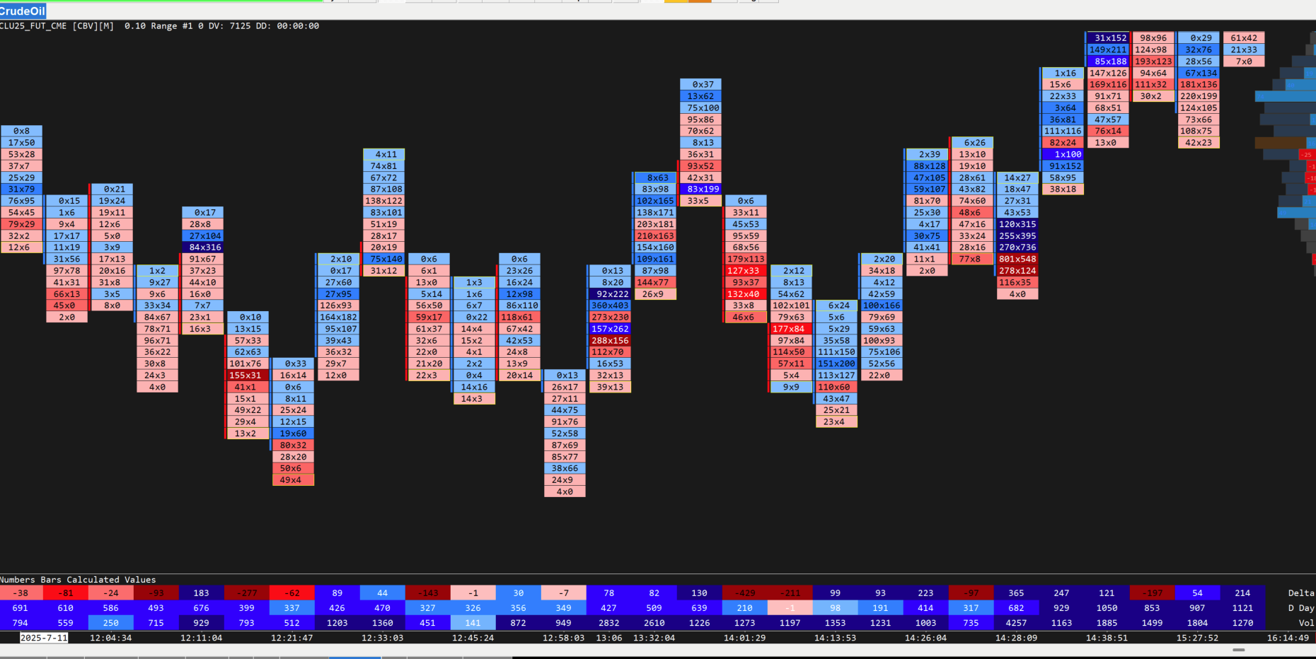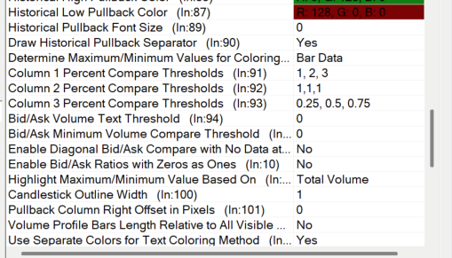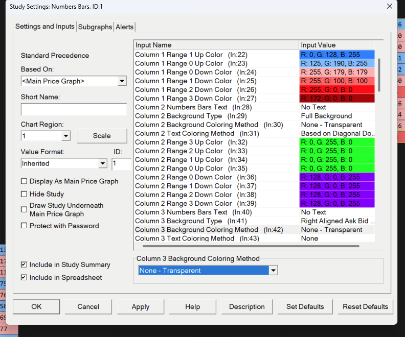 The Numbers Bars study allows you to have up to 3 columns of data. The first column you have configured to show the Bid x Ask numbers and to color the background according to the colors setup for Column 1. You do not have anything setup to display in Column 2, so that is why the green and purple coloring is not seen. If you want to color the data in Column 1, then you need to change that columns colors. Refer to the following: Numbers Bars: Column # Range 3 Up Color For the most reliable, advanced, and zero cost futures order routing, use the Teton service: Sierra Chart Teton Futures Order Routing |