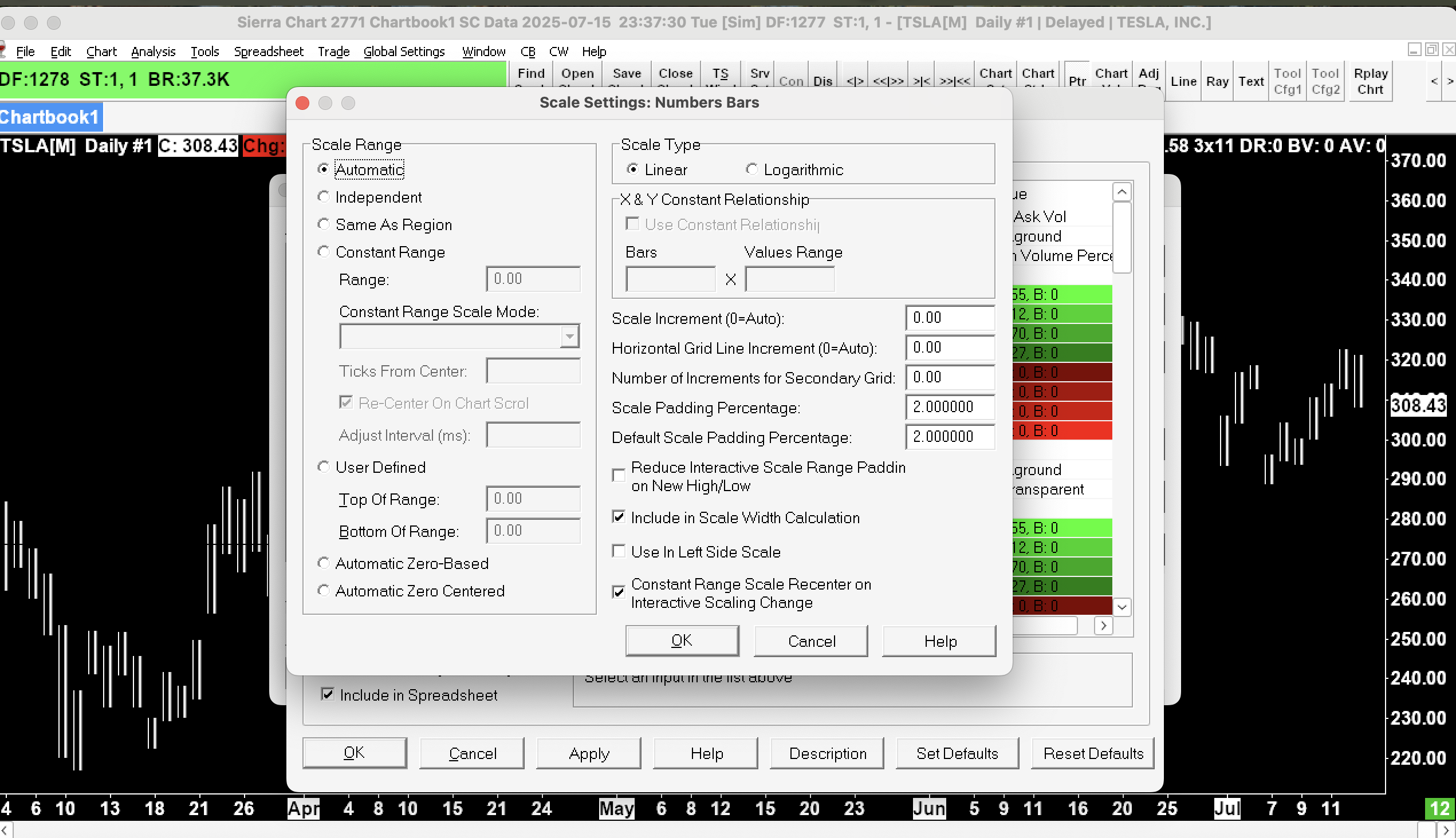 Thank you, John, for the quick response. I checked the Chart Scale Range setting, and it is set to Automatic—I haven’t made any changes to it. Additionally, under Analysis for the Number Bar Study, the Scale Range is also set to Automatic, which I have not modified either. (Screenshots attached) I’d appreciate your further assistance in resolving this issue. Best regards, Mohit |