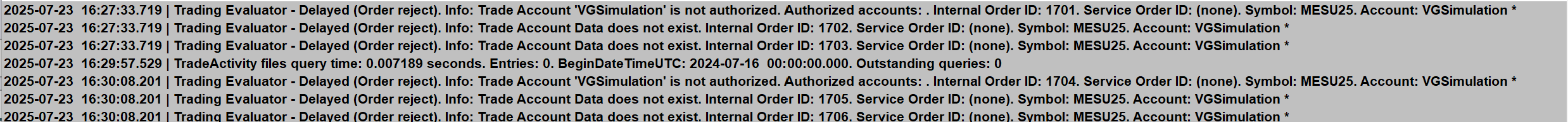 You cannot use this service: 2025-07-24 03:08:44.458 | Current selected Data/Trading service: Trading Evaluator It needs to be: Trading Evaluator - Delayed. Since you do not have access to real-time data. However, we very strongly at this point recommend using the following feature: Trade Simulation With the issues that you are having, please do not use the Trading Evaluator services. There are no reason for issues, but apparently you are misunderstanding those services. Sierra Chart Support - Engineering Level Your definitive source for support. Other responses are from users. Try to keep your questions brief and to the point. Be aware of support policy: https://www.sierrachart.com/index.php?l=PostingInformation.php#GeneralInformation For the most reliable, advanced, and zero cost futures order routing, use the Teton service: Sierra Chart Teton Futures Order Routing Date Time Of Last Edit: 2025-07-24 15:28:12