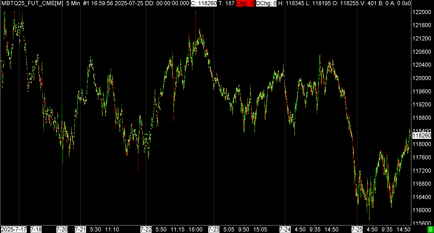 The problem you are having is due to a Continuous Futures Contract and our rollover settings not matching what the end of trading is for the symbol. Our symbol settings for MBT uses a rollover of "The Last Thursday of the Contract Month". Whereas the end of trading is the Last Friday of the month: https://www.cmegroup.com/markets/cryptocurrencies/bitcoin/micro-bitcoin.contractSpecs.html Therefore, trading ended on Friday July 25, 2025, at 10:00am Central US time. But the rollover is not set to occur until the end of July. We will add a new setting for Last Friday of the Contract Month. One final note, whenever posting an image of a chart always use this method and follow it precisely: Support Board Posting Information: Attaching or Posting a Screenshot/Image (Optional) This would have made us understood what the problem is from the very beginning. We were misled and looking at the wrong contract month. It was the prior contract month of the chart you posted. Not the current one. Sierra Chart Support - Engineering Level Your definitive source for support. Other responses are from users. Try to keep your questions brief and to the point. Be aware of support policy: https://www.sierrachart.com/index.php?l=PostingInformation.php#GeneralInformation For the most reliable, advanced, and zero cost futures order routing, use the Teton service: Sierra Chart Teton Futures Order Routing Date Time Of Last Edit: 2025-07-28 21:44:02