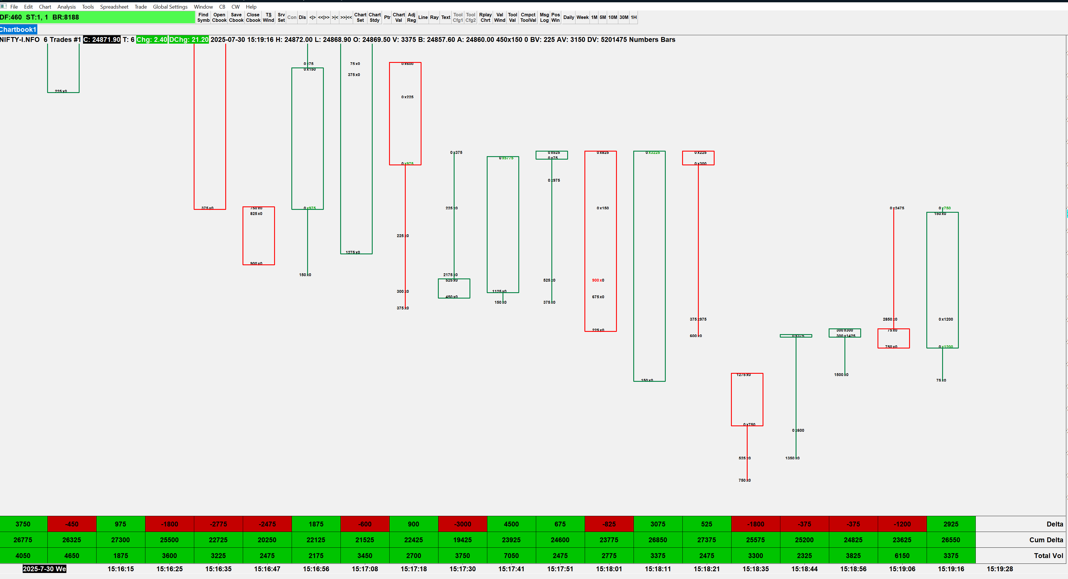 That data is from Global Data Feeds - India. You would need to talk to them about it. It is definitely not an issue with our Numbers Bars study. One item of note, we do not recommend changing the Tick Size. If you want to accumulate the data for the Numbers Bars (and other Volume studies) for multiple prices into a single level, then use the "Volume At Price Multiplier". Refer to the following: Chart Settings: Volume at Price Multiplier for Historical/Intraday Chart (Chart >> Chart Settings >> Chart Data >> Volume at Price menu) For the most reliable, advanced, and zero cost futures order routing, use the Teton service: Sierra Chart Teton Futures Order Routing |
