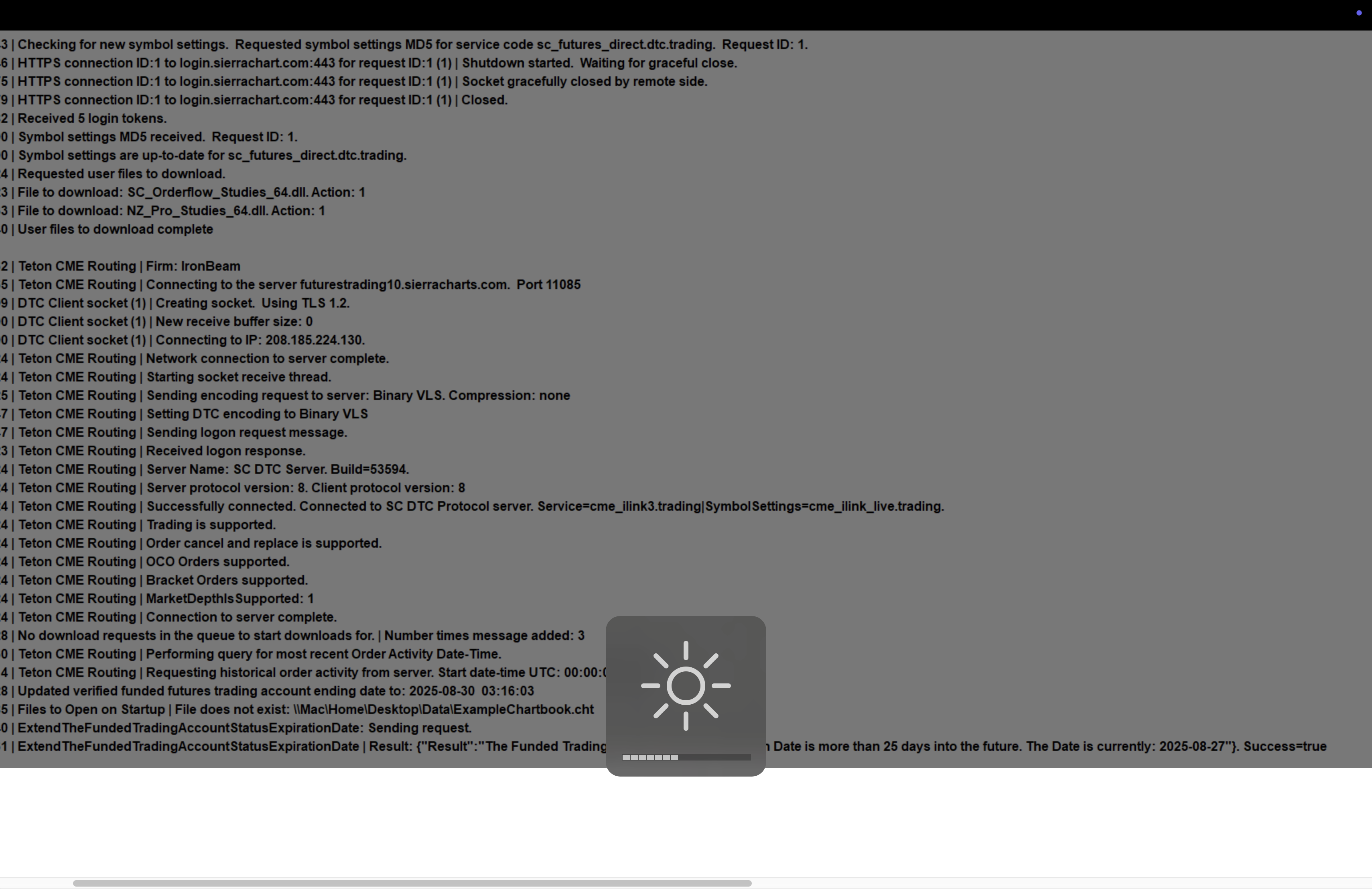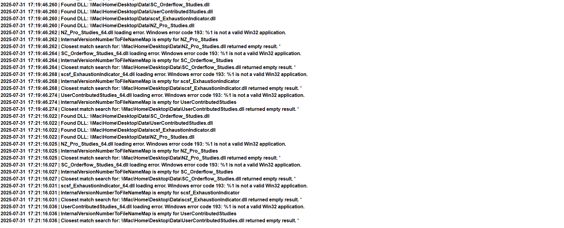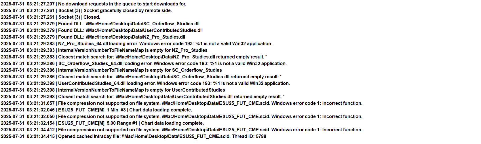 Running Sierra Chart and trying to load dlls from the \\Mac\Home\Desktop\Data\ shared folder path is probably something to do with it. Even the built-in UserContributedStudies_64.dll does not load properly for the same reason. |