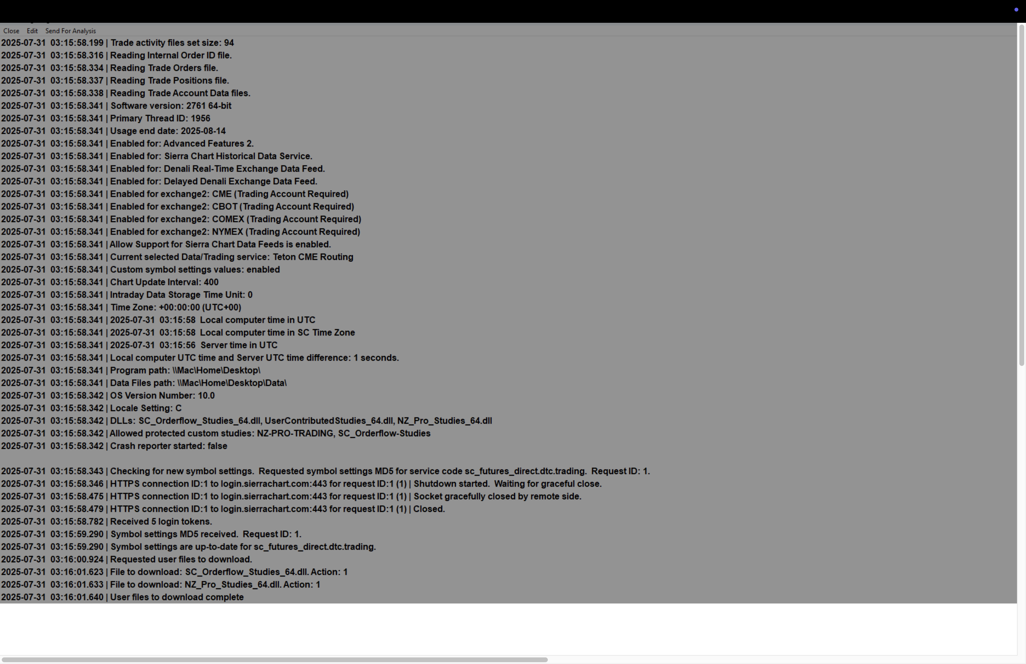 We see that you are setup to get 3 files with the following names: - EXHAUSTION. - NZ-PRO-TRADING - SC_Orderflow-Studies We do not know which of these is the one you are referring to, or maybe all 3. But we do see these in your log as showing up properly in your system. Make sure you are following these instructions to access a custom study: How to Use an Advanced Custom Study or a Study Collection: How to Use an Advanced Custom Study Provided To You For the most reliable, advanced, and zero cost futures order routing, use the Teton service: Sierra Chart Teton Futures Order Routing |