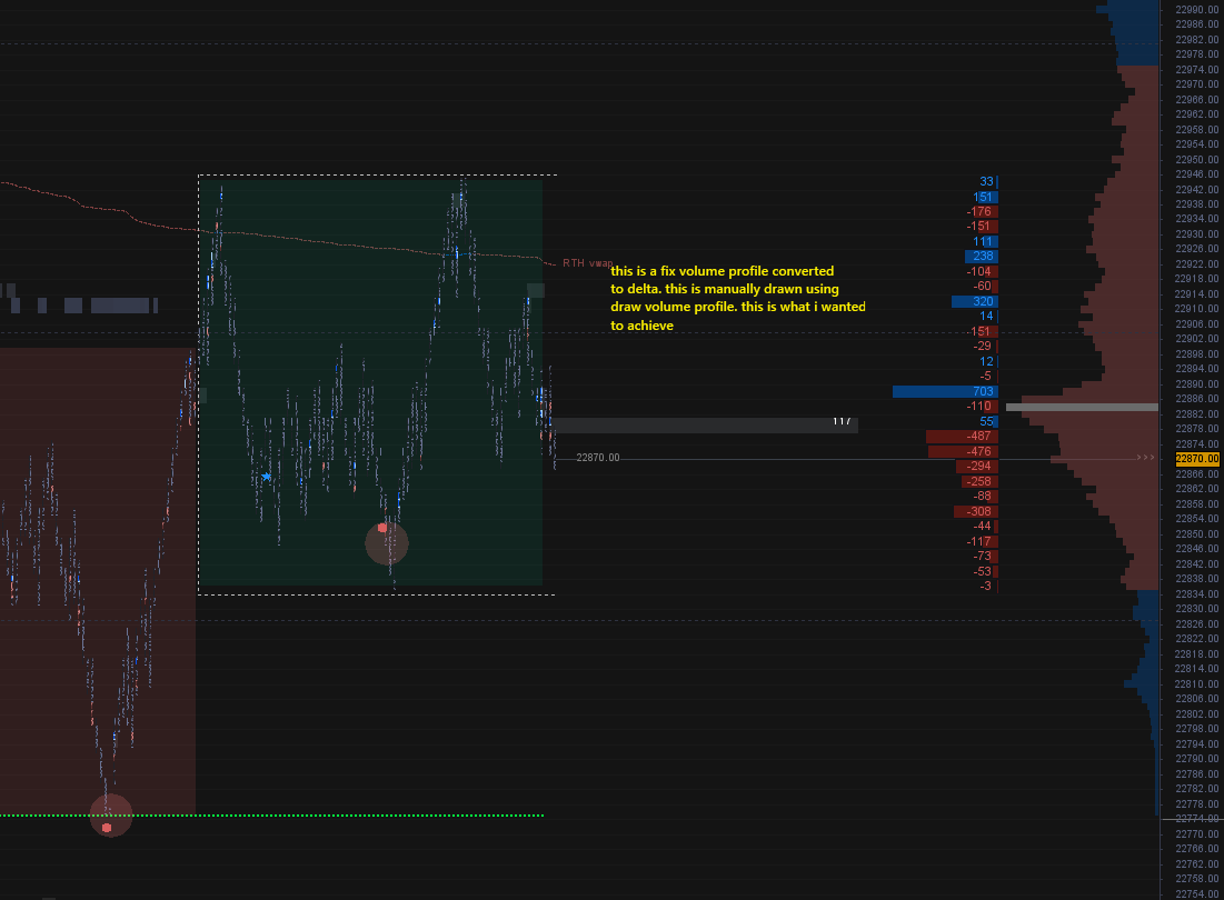 I'm trying to create a volume profile that displays deltas instead of standard volume. I want to automate this process, as I saw a YouTube video demonstrating volume-by-price profiles updating every 5 minutes. I'd like to achieve the same but with a 90-minute interval. You mentioned that using Renko bars prevents the profile from resetting correctly, but I'm basing the study on time, not the bars themselves. I tried configuring it as follows: Volume graph period type: One period at the end of a fixed time length Time period type for fixed time: Minutes Time period length: 90 However, the profile doesn't reset every 90 minutes as expected. |