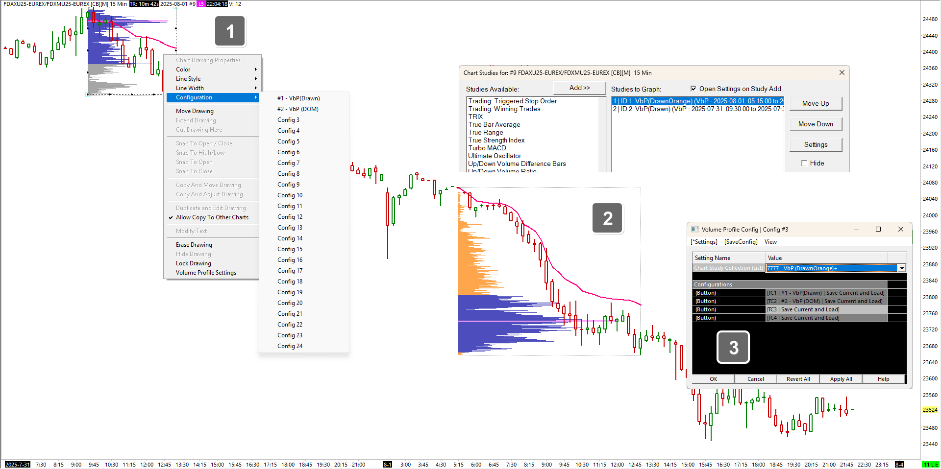 I have problems creating a new VbP TC(x) (see pic). #1 - I already created TC1 a long time ago. No problem... #2 - Here I created a new profile and saved it as StudyColl “7777 - VbP (DrawnOrange)+”. #3 - At “VolumeProfileConfig” I wanted to create it as TC3, but I failed at this step. I did not manage to save it as TC3. Basically, I wanted to create several TC(x ), but failed. Maybe you can explain the whole process step by step. I have tried to work it out from the descriptions, but in my opinion this process in particular is not described in detail for VbP. (I hope I have explained it clearly) Thank you very much |
