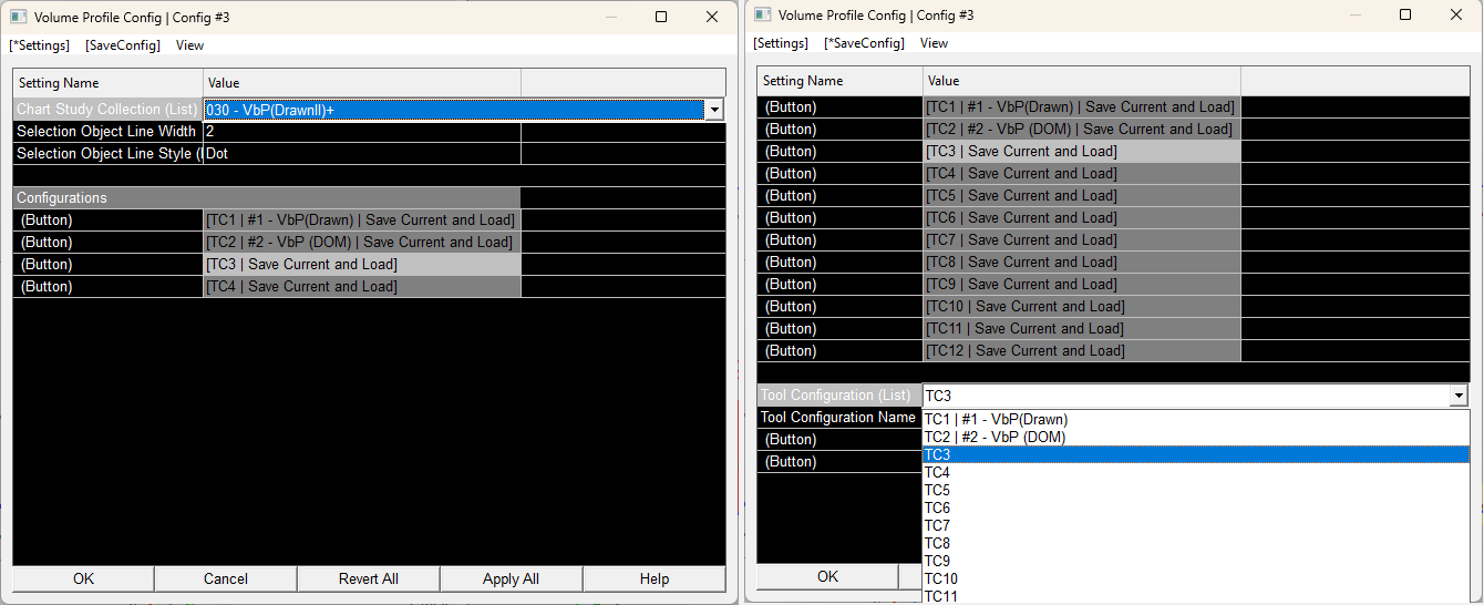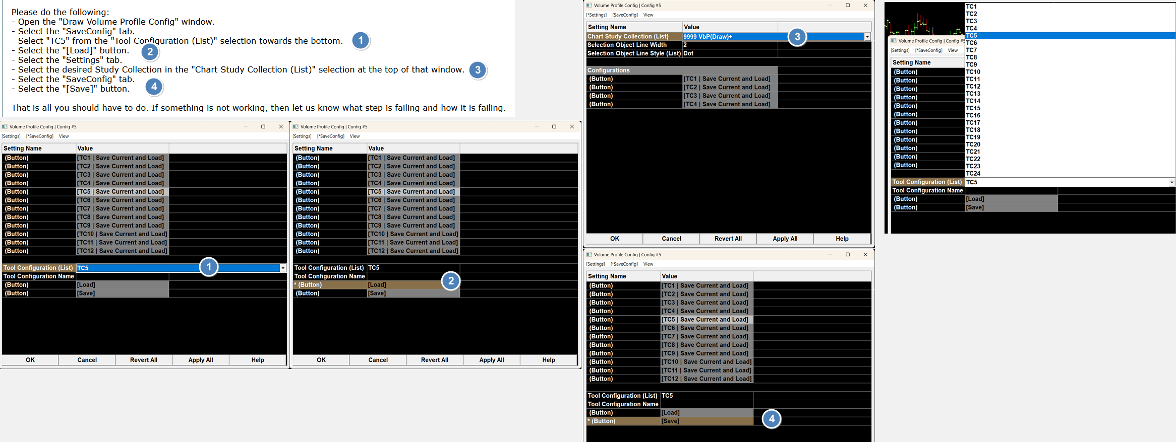 Please do the following: - Open the "Draw Volume Profile Config" window. - Select the "SaveConfig" tab. - Select "TC5" from the "Tool Configuration (List)" selection towards the bottom. - Select the "[Load]" button. - Select the "Settings" tab. - Select the desired Study Collection in the "Chart Study Collection (List)" selection at the top of that window. - Select the "SaveConfig" tab. - Select the "[Save]" button. That is all you should have to do. If something is not working, then let us know what step is failing and how it is failing. For the most reliable, advanced, and zero cost futures order routing, use the Teton service: Sierra Chart Teton Futures Order Routing |
