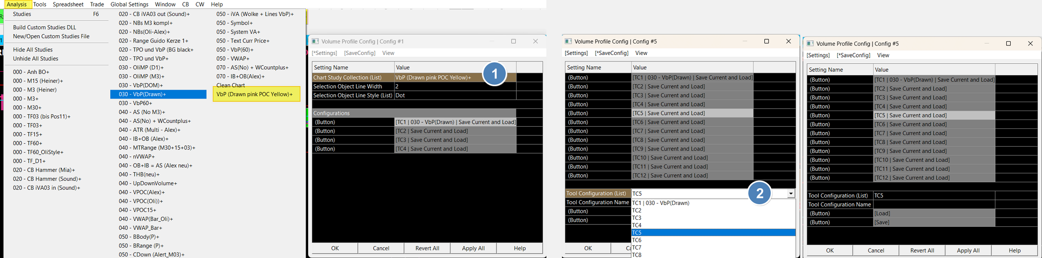 Hi John, please take a look at the pic. I followed your instructions step by step— thank you very much for that — but unfortunately I was unable to save as TC5. The StudyColl. is recognized in the tab “Settings”/Chart Study Collection (List), but not in the tab ‘SaveConfig’(from my point of view). The StudyColl. will not be recognized in every single line, so that it is impossible to create a TC“x”. On the far right of the pic, you can see that the "TC" list is completely empty, even though I loaded and saved it according to your instructions. The process for “Draw VbP Config” differs greatly from the others... |
