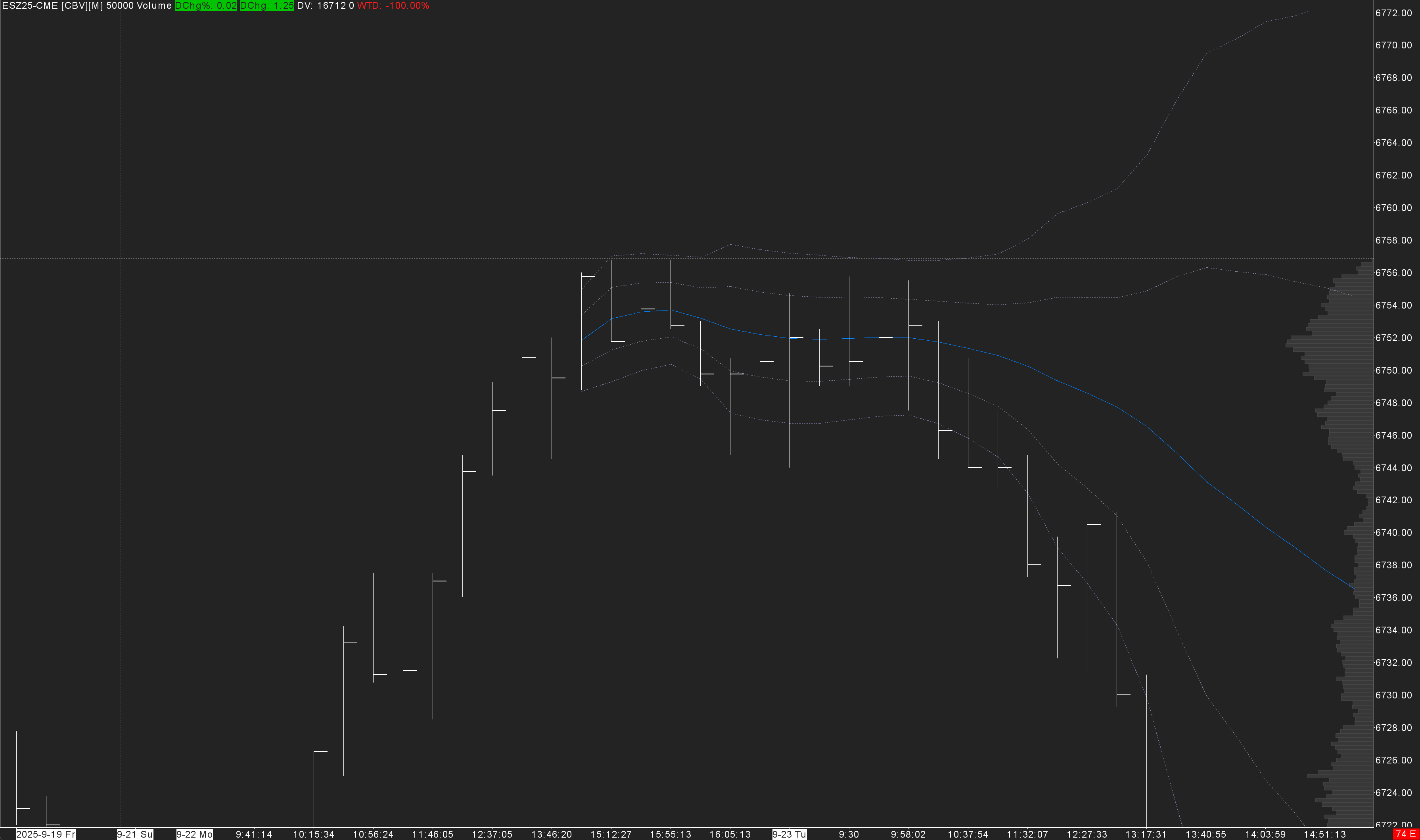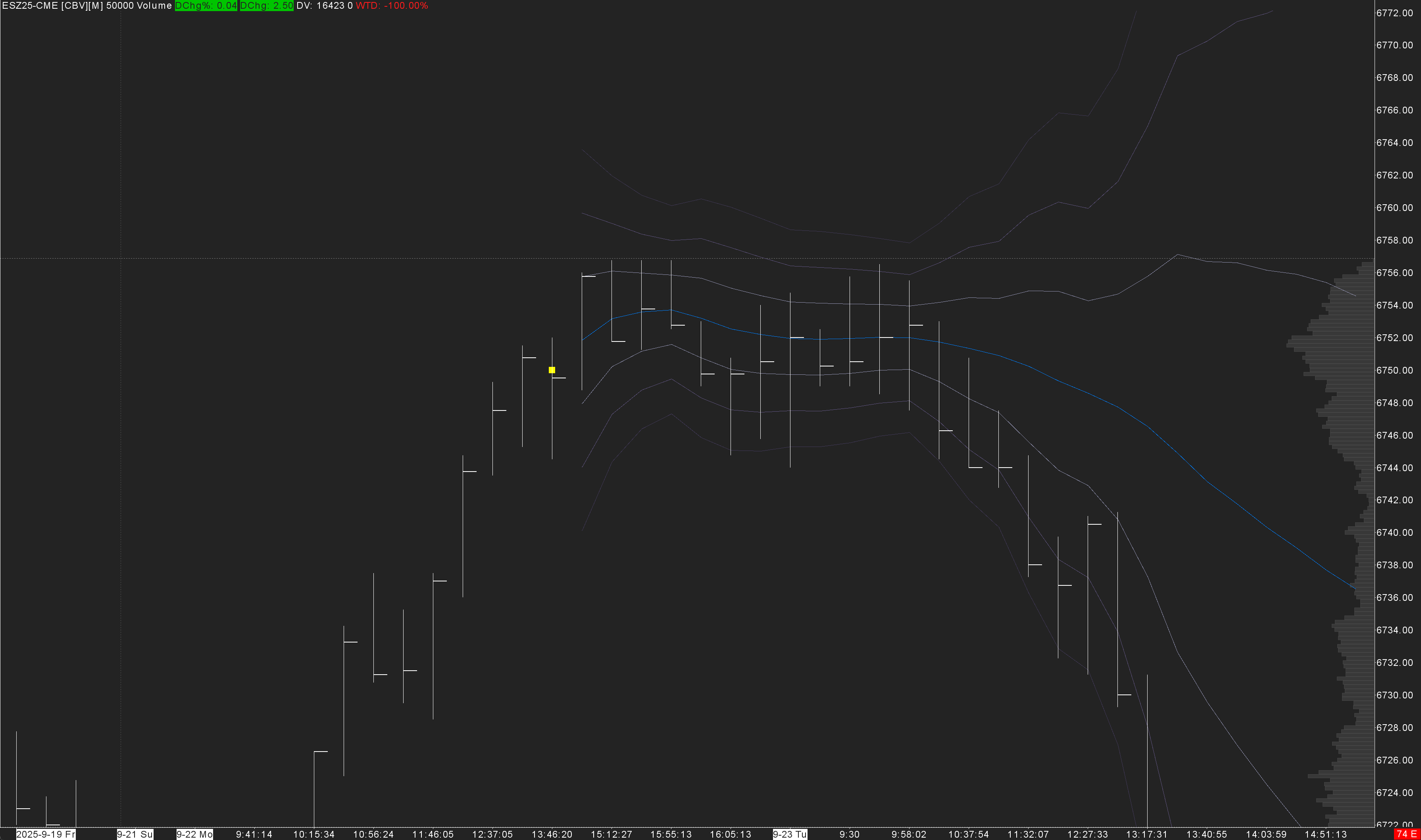 To reproduce: 1. Create a 4H chart of ESU25-CME, 10-15 days should be sufficient to demonstrate. 2. Set the time zone to NY/Eastern US, day session times to 9:30 - 15:59:59, full session 18:00 - 17:59:59. 3. Ensure "Use Evening Session" and "New Bar at Session Start" are set to Yes. Draw a VbP over a few bars. Now select it, and drag the right edge over to the right. You will find that it is impossible to end the profile on the 06:00 bar. You can either end it at the 02:00 bar, or the 09:30 bar, but not the 06:00 one. If you disable "New Bar at Session Start" so that there are only 18:00, 22:00, 02:00, 06:00, 10:00, and 14:00 bars, this problem does not occur. Something with the way it's setting the end date/time of the profile with the odd 09:30 bar is causing it. |