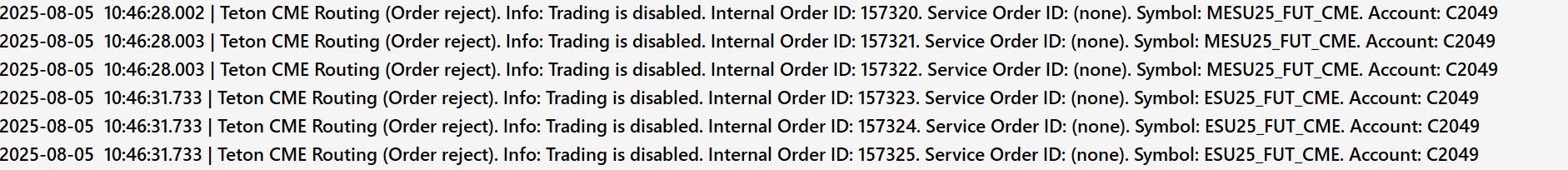 When I place market and limit orders on ES and MES the orders show up for a split second on the chart and then disappear. See attached for message in Trade Service Log and the settings I currently have enabled. My broker said the issue is not from their end and I should be able to place trades. |