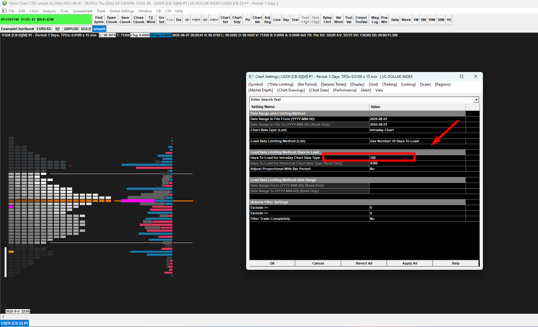 We are not seeing any issue with this. Make sure you are requesting the additional data by following these instructions: Historical Intraday Data (Missing Data / Download Errors / Viewing More Data): Using 'Date Range in File >> From' to Download More Historical Data And although it should not make a difference, set the option for "Chart >> Chart Settings >> Symbol >> Continuous Contract" to "None", as this is not a Futures contract. For the most reliable, advanced, and zero cost futures order routing, use the Teton service: Sierra Chart Teton Futures Order Routing |