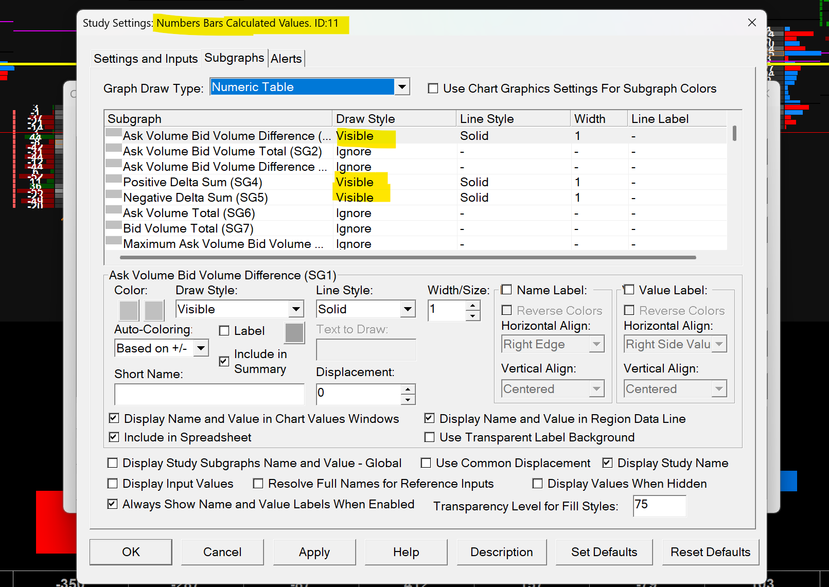 The only settings i found on the Number Bar Calculated Values is: Total Vol. It doesn't have the other4 options available like i seen on many other sample layouts abroad from SC What is delta? Ask Volume - Bid Volume * Max DELTA = Maximum Ask Volume Bid Volume Difference * Min DELTA = Minimum Ask Volume Bid Volume Difference * DELTA = Ask Volume Bid Volume Difference * DELTA % = Ask Volume Bid Volume Difference Percent How and Where can i get these 5 specific subgraphs? Read the docs that the user above linked. In the image you shared, whoever made it has set short names for the subgraphs. |