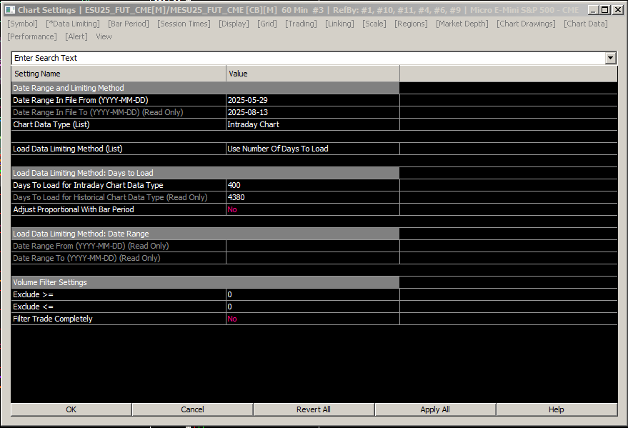 Symbol: From the Message Log - 2025-08-12 18:03:57.305 | ESU25_FUT_CME/MESU25_FUT_CME [CB] 5 Min #4 | Waiting for historical downloads to complete with the IDs: 1, 2025-08-12 18:03:57.305 | ESU25_FUT_CME/MESU25_FUT_CME #5 | Reloading chart. 2025-08-12 18:03:57.336 | ESU25_FUT_CME/MESU25_FUT_CME [CB] 7500 Trades #7 | Reloading chart. 2025-08-12 18:03:57.336 | ESU25_FUT_CME/MESU25_FUT_CME [CB] 7500 Trades #7 | Waiting for historical downloads to complete with the IDs: 1, 2025-08-12 18:03:57.399 | ESU25_FUT_CME/MESU25_FUT_CME [CB] 30 Sec #1 | Reloading chart. 2025-08-12 18:03:57.414 | ESU25_FUT_CME/MESU25_FUT_CME [CB] 30 Sec #1 | Waiting for historical downloads to complete with the IDs: 1, 2025-08-12 18:03:57.446 | ESU25_FUT_CME/MESU25_FUT_CME [CB] 2500 Trades #9 | Reloading chart. 2025-08-12 18:03:57.461 | ESU25_FUT_CME/MESU25_FUT_CME [CB] 2500 Trades #9 | Waiting for historical downloads to complete with the IDs: 1, 2025-08-12 18:03:57.555 | ESU25_FUT_CME/MESU25_FUT_CME [CB] 30 Sec #10 | Reloading chart. 2025-08-12 18:03:57.570 | ESU25_FUT_CME/MESU25_FUT_CME [CB] 30 Sec #10 | Waiting for historical downloads to complete with the IDs: 1, 2025-08-12 18:03:57.586 | ESU25_FUT_CME/MESU25_FUT_CME [CB] 15 Min #11 | Reloading chart. 2025-08-12 18:03:57.602 | ESU25_FUT_CME/MESU25_FUT_CME [CB] 15 Min #11 | Waiting for historical downloads to complete with the IDs: 1, 2025-08-12 18:03:57.633 | ESU25_FUT_CME/MESU25_FUT_CME [CB] 60 Min #3 | Reloading chart. 2025-08-12 18:03:57.633 | ESU25_FUT_CME/MESU25_FUT_CME [CB] 60 Min #3 | Limiting the number of years to 20 years to load data for the continuous futures chart. Reason: 20 years maximum for Intraday charts. 2025-08-12 18:03:57.633 | ESU25_FUT_CME/MESU25_FUT_CME [CB] 60 Min #3 | Limiting the number of years to download historical data to 20 years for the continuous futures chart. Reason: 20 years maximum for Intraday charts. 2025-08-12 18:03:57.633 | Added historical Intraday data request for ESU05_FUT_CME to the queue. 2025-08-12 18:03:57.633 | ESU25_FUT_CME/MESU25_FUT_CME [CB] 60 Min #3 | Performing continuous chart historical Daily data download for symbol ESU05_FUT_CME starting at last date in file. 20 years is excessive. Regarding your link for Historical Intraday Data, that was the first thing I checked - as I explained in "Part 2" Regarding Errors from Continuous Contract, yes, there are many for all the "years" of data it is trying to download. A clip from the message log - 2025-08-12 18:04:01.221 | ESU25_FUT_CME/MESU25_FUT_CME [CB] 60 Min #3 | Limiting the number of years to 20 years to load data for the continuous futures chart. Reason: 20 years maximum for Intraday charts. 2025-08-12 18:04:01.221 | ESU25_FUT_CME/MESU25_FUT_CME [CB] 60 Min #3 | Limiting the number of years to download historical data to 20 years for the continuous futures chart. Reason: 20 years maximum for Intraday charts. 2025-08-12 18:04:01.377 | ESU25_FUT_CME/MESU25_FUT_CME [CB] 60 Min #3 | Error while getting daily settlement price with date 2006-09-08 from file. C:\SierraChart\Data\ESZ06_FUT_CME.dly. Error: No Data for read. End of file. 2025-08-12 18:04:01.377 | ESU25_FUT_CME/MESU25_FUT_CME [CB] 60 Min #3 | Error while getting daily settlement price with date 2006-12-15 from file. C:\SierraChart\Data\ESZ06_FUT_CME.dly. Error: No Data for read. End of file. 2025-08-12 18:04:01.377 | ESU25_FUT_CME/MESU25_FUT_CME [CB] 60 Min #3 | Error while getting daily settlement price with date 0 from file. C:\SierraChart\Data\ESH07_FUT_CME.dly. Error: No Data for read. End of file. 2025-08-12 18:04:01.377 | ESU25_FUT_CME/MESU25_FUT_CME [CB] 60 Min #3 | Error while getting daily settlement price with date 2007-03-16 from file. C:\SierraChart\Data\ESH07_FUT_CME.dly. Error: No Data for read. End of file. 2025-08-12 18:04:01.377 | ESU25_FUT_CME/MESU25_FUT_CME [CB] 60 Min #3 | Error while getting daily settlement price with date 0 from file. C:\SierraChart\Data\ESM07_FUT_CME.dly. Error: No Data for read. End of file. The chart settings I currently have in place have existing for the past several years - especially the chart days back. This happened after the current version update. I have tried to go back to 2761 and then 2768 and the program locks up to the point I have to use Task Manager to close it down. Reloaded with 2782 and here we are. I've uploaded a screen shot of my 60min chart settings for Data Limiting. If you'd like to see anything else, please tell me. But as I said, the selection for "Use Number of Days To Load is 400, but the Date Range In File From setting is stuck on 2025-05-29. If I change this date, it auto reverts back to May 29. Help please... |