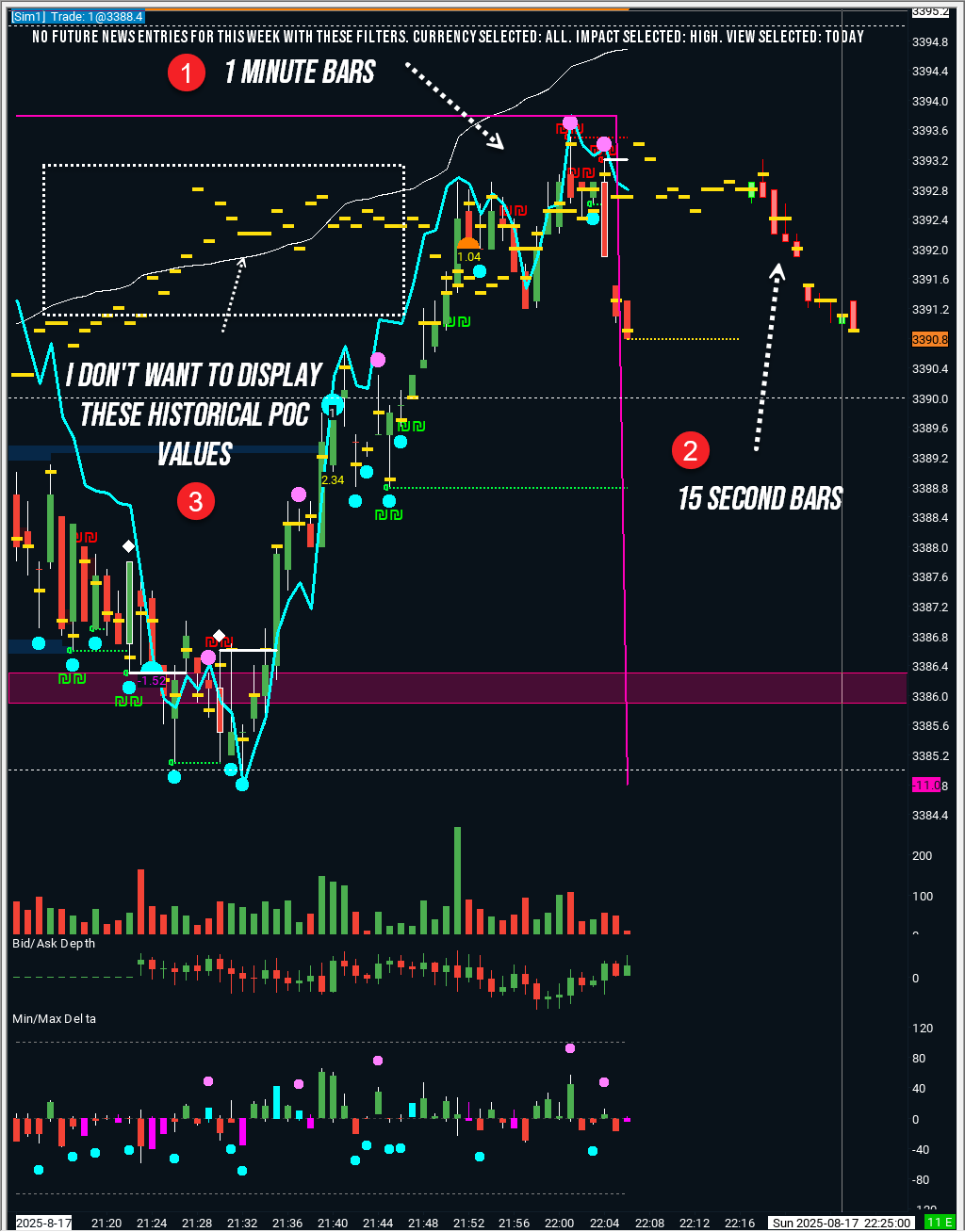 Hello, I was wondering if it was possible to overlay another chart on a lower timeframes' Volume Point Of Control For Bars while also limiting the number of bars to overlay. 1. I overlayed a 15 second chart to my 1 minute chart using Overlay Non-Sync which has the "Number of bars to overlay" I set it to 10 to get the latest 10 values 2. I used the Study/Price Overlay to overlay Volume Point Of Control from the 15 second chart Now I would like to plot only the last 10 bars of the 15 second timeframe Volume Point Of Control on my 1 minute chart Thank you! Date Time Of Last Edit: 2025-08-18 02:12:36