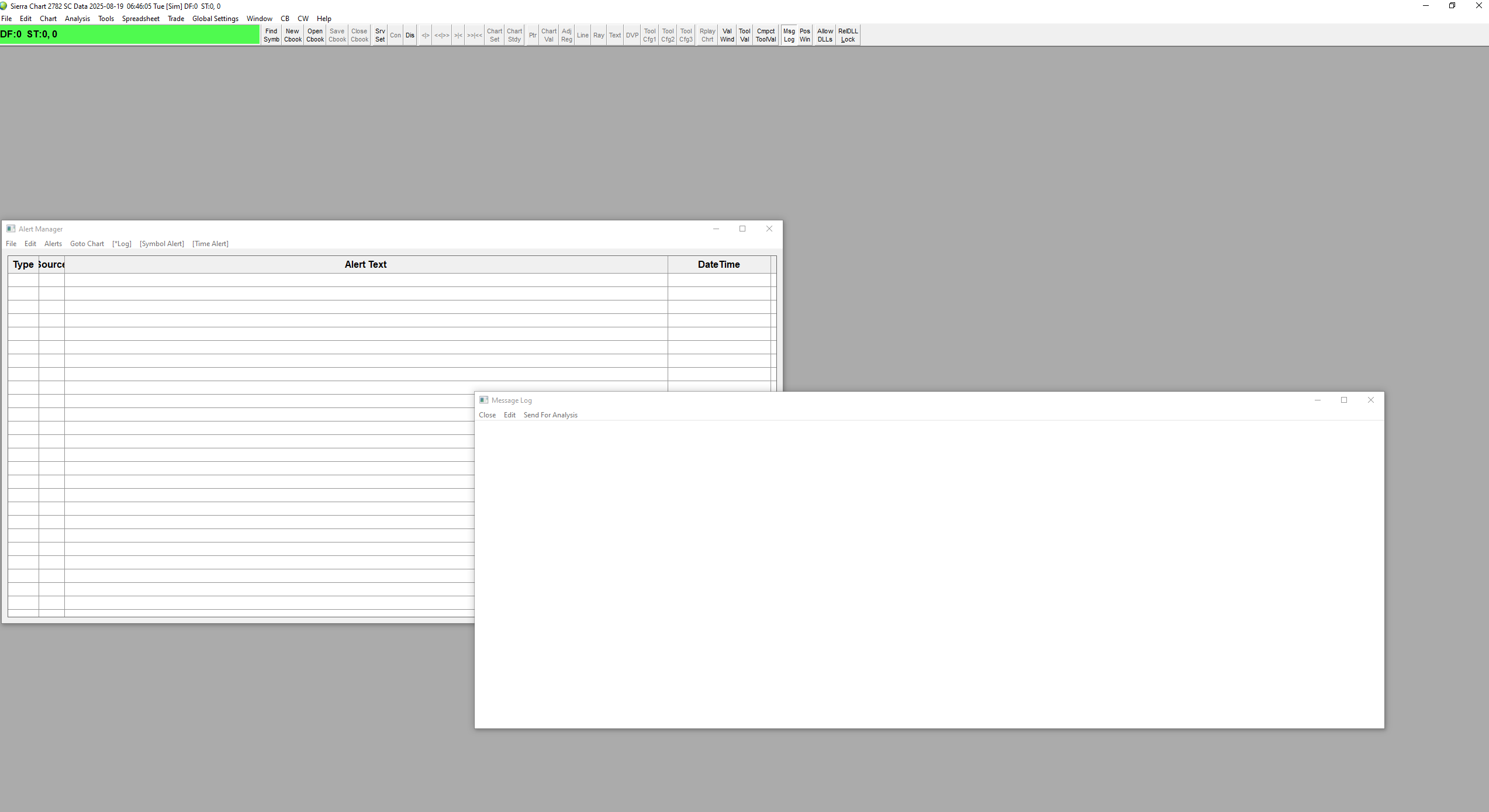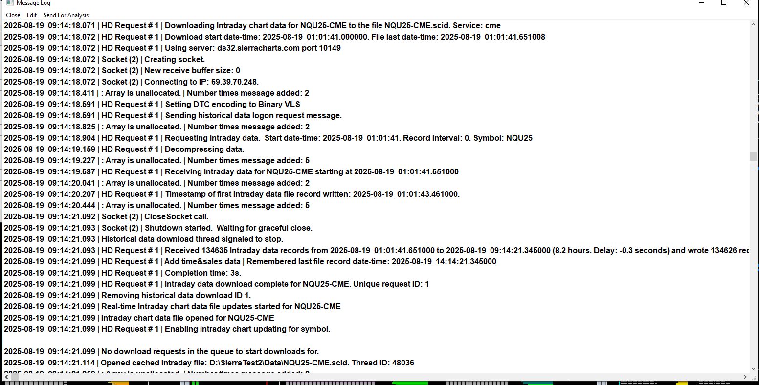 When the Message Log is blank, check the following setting: General Settings Window: Disable Visual Message Logging Also check to see if you have turned off all the options for what gets put into the Message Log. Refer to the following: Message Categories With regards to the "Array is unallocated" error you are getting, you can ignore it. It is odd, but it can occur. Sierra Chart correctly handles these kind of situations. If you are using a third party study that is producing that error, then you should let the developer know about that error. For the most reliable, advanced, and zero cost futures order routing, use the Teton service: Sierra Chart Teton Futures Order Routing |