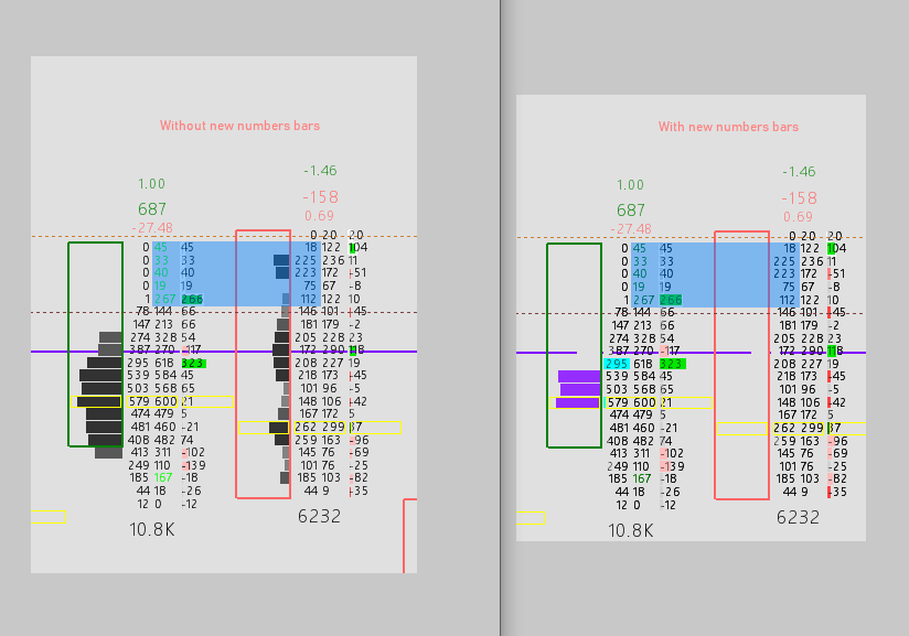 Context: I currently have a - Numbers Bars with 3 columns - The 1st column is a volume profile colored based on volume percentage I would like a - 2nd Numbers Bars with 3 columns to add some features - Eg: I would like to now colour the 1st column which is a volume profile just like from previous Numbers Bars but with actual volume - I specifically only wanted to highlight high volume price levels in the Numbers Bar relative to the session so I made all the other colors equal to my background except Range 3 color Problem: - Clearly, the colors start conflicting. I.e depending on the order of the studies, 1 will hide the other or mess up. - I have attached a picture to show what I mean by "conflicting" - So I tried a "Color Bar ... Based on Alert Condition" and tried VAP(C,0) > XXX. This doesn't work either Qn: - Is there any way to circumvent this? Thanks! |