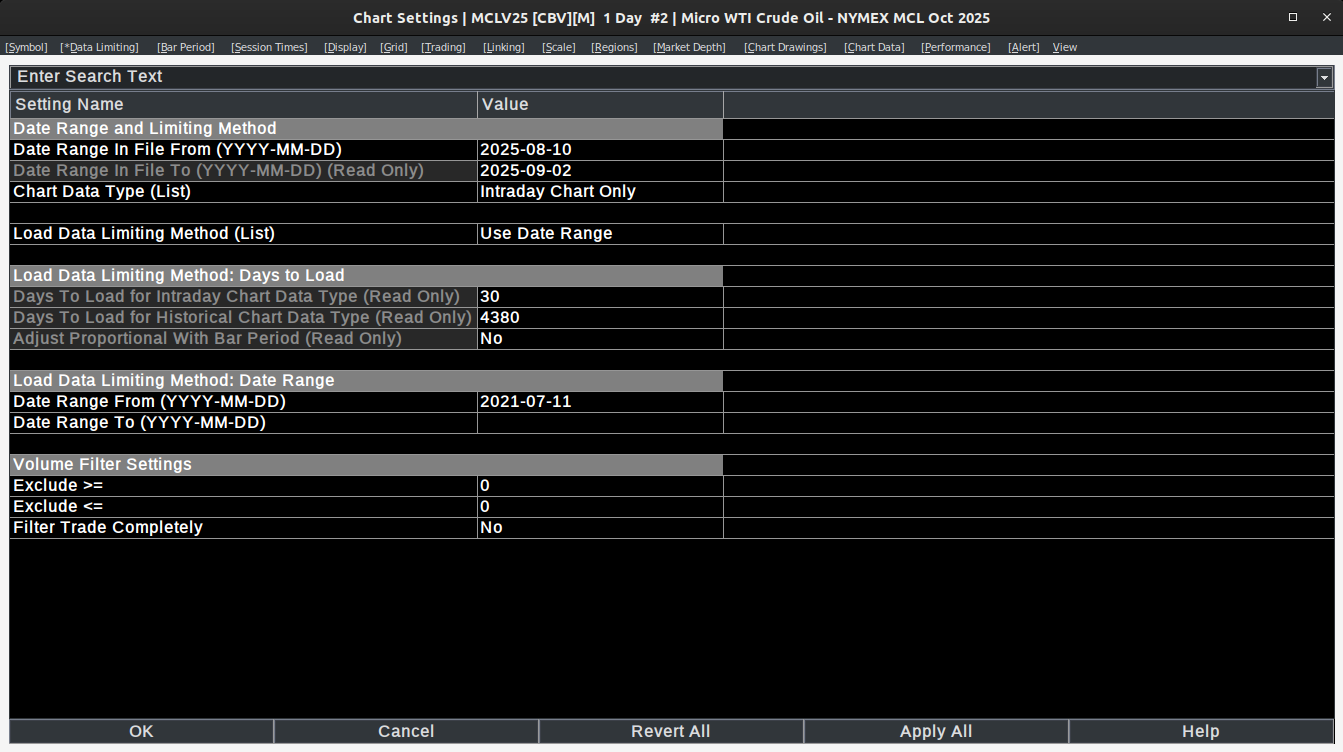 Is not Chart >> Chart Settings >> Data Limiting >> Load Data Limiting Method: Days to Load >> Days to Load for Historical/Intraday Chart Data Type irrelevant when I have selected Load Data Limiting Method >> Use Date Range ?I have attached my Data Limiting settings for MCL, which I have changed the Date Range From from previously 2000-01-02, to 2021-07-11 which is within range of the data your servers provide.I deleted and redownloaded all MCL data with these settings, but when I restart sierra I still see logs requesting data from 1923, 1922, etc. on startup. Am I still doing something wrong? Date Time Of Last Edit: 2025-09-02 19:23:00