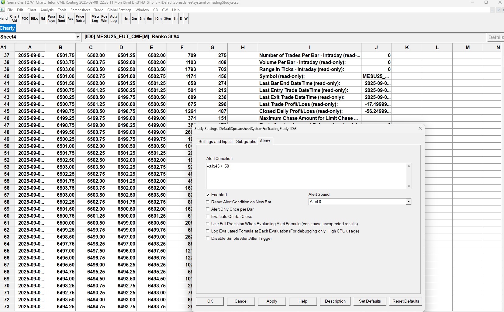 The Spreadsheet System for Trading and the Spreadsheet System/Alert both have capabilities for alerting within the spreadsheet itself. You do not need to use the "Alerts" tab of the settings window in order to do this. Find an unused formula column in your Spreadsheet System for Trading and enter the following in row 3 of that column: =$J$45 < -500 Then on the Settings and Inputs tab of the Settings window for that Spreadsheet System for Trading, find the "Column ? Alert" entry for the column where you entered this formula and select the Alert Sound you want to use for it. You will then get an alert sound when the "Closed Daily Profit/Loss" is less than -500. Refer to the following: Spreadsheet Systems, Alerts and Automated Trading: Column [K, L, M, N, O, P, Q, R, S, T, U, V-Z] Alert If you want something visual, then you would want to add a "Color Bar Based on Alert Condition" study and reference the subgraph that represents that column. Refer to the following: Color Bar Based on Alert Condition For the most reliable, advanced, and zero cost futures order routing, use the Teton service: Sierra Chart Teton Futures Order Routing |
