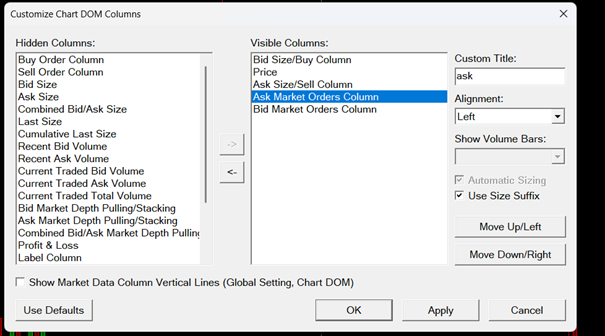 https://www.sierrachart.com/image.php?Image=1757435926963.png Hi, I just updated my service package to 12 and as shown in the image, I would like to see the Ask and bid market orders columns (named them Ask and Bid in image) which I added via > trade > customize chart dom columns (see added attached file "DOM"). My problem is that I don't get any data showing up on DOM which I attached to chart. I followed the steps described via next link, but output stays the same. Market By Order Data Any ideas how I might solve this? Thanks in advance Jos |