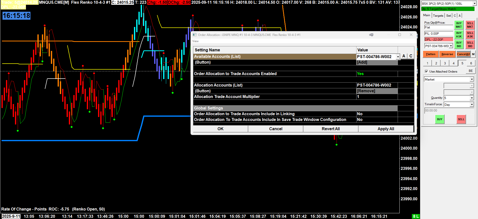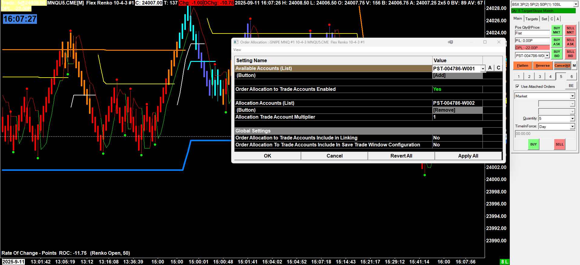 I have two Stage 5 prop accounts both are on the same chartbook. Here are the steps that I used to set up the trade copier In both charts, in the trade window I Click M>>Settings>>Enable Order Allocation to Trade Accounts. Then in the first chart from M>>Settings>> Order Allocation to Trade Accounts I choose one of the two accounts and Click ADD which moves it down to the Allocation Accounts (List). I set Order Allocation to Trade Accounts Enabled to Yes and Allocation Trade Account Multiplier = 1. I Click Apply All and OK. On the second chart, I select the same account that I pushed down to Allocation Accounts (List). For a couple of weeks I successfully used this setup in Sim 1 mode. Today I switched to the two prop accounts. On the first trade executed everything worked fine confirmed by Rithmic Pro. Both accounts show that they were completed with the same results. On the second trade execution a Trade Log messages comes up stating that I was trying to trade the same account from both Trade Windows. Before I tried to execute the second trade, Sierra Chart had changed the Allocation Trade Accounts (List) to match the Available Accounts (List). I had not selected the account it was displaying. The following is a copy of the section of the Trade Log showing the two accounts. 2025-09-11 04:50:43.815 | Rithmic Direct - DTC | Requesting trade accounts from server. 2025-09-11 04:50:43.881 | Rithmic Direct - DTC | Performing query for most recent account balances Date-Time for Trade Account: PST-xxxxx-W002. 2025-09-11 04:50:43.882 | Rithmic Direct - DTC | Performing query for most recent account balances Date-Time for Trade Account: PST-xxxxx-W001. 2025-09-11 04:50:43.882 | Rithmic Direct - DTC | Received 2 accounts from service. 2025-09-11 04:50:43.926 | TradeActivity files query time: 0.045276 seconds. Entries: 0. BeginDateTimeUTC: 00:00:00.000. Outstanding queries: 1 2025-09-11 04:50:43.927 | Rithmic Direct - DTC | Requesting historical account balances for account PST-xxxxx-W002. Start date-time UTC: 2025-05-10 11:50:43 2025-09-11 04:50:43.959 | TradeActivity files query time: 0.032838 seconds. Entries: 0. BeginDateTimeUTC: 00:00:00.000. Outstanding queries: 0 2025-09-11 04:50:43.959 | Rithmic Direct - DTC | Requesting historical account balances for account PST-xxxxx-W001. Start date-time UTC: 2025-05-10 11:50:43 2025-09-11 04:50:44.080 | Rithmic Direct - DTC | Requesting Trade Positions data. 2025-09-11 04:50:47.051 | TradeActivity files query time: 0.383481 seconds. Entries: 0. BeginDateTimeUTC: 00:00:00.000. Outstanding queries: 0 Here are the error messages that the Trade Log shows that the two Trade Window accounts match and SC is trying to execute the same account from two difference Trade Windows. 2025-09-11 06:17:51.008 | Order modification failed (InternalOrderID) | Price and quantity (23937.00, 0) for order modification are the same as existing order. | Modifying Attached Order from parent modification. Parent base price: 23940.00. New price: 23937.00. Internal Order ID: 17404. Service Order ID: (none). Symbol: MNQU5.CME. Account: PST-xxxxx-W002 * 2025-09-11 06:17:51.009 | Order modification failed (InternalOrderID) | Price and quantity (23950.00, 0) for order modification are the same as existing order. | Modifying Attached Order from parent modification. Parent base price: 23940.00. New price: 23950.00. Internal Order ID: 17405. Service Order ID: (none). Symbol: MNQU5.CME. Account: PST-xxxxx-W002 * 2025-09-11 06:17:51.009 | Order modification failed (InternalOrderID) | Price and quantity (23935.00, 0) for order modification are the same as existing order. | Modifying Attached Order from parent modification. Parent base price: 23940.00. New price: 23935.00. Internal Order ID: 17407. Service Order ID: (none). Symbol: MNQU5.CME. Account: PST-xxxxx-W002 * 2025-09-11 06:17:51.009 | Order modification failed (InternalOrderID) | Price and quantity (23950.00, 0) for order modification are the same as existing order. | Modifying Attached Order from parent modification. Parent base price: 23940.00. New price: 23950.00. Internal Order ID: 17408. Service Order ID: (none). Symbol: MNQU5.CME. Account: PST-xxxxx-W002 * 2025-09-11 06:17:51.009 | Order modification failed (InternalOrderID) | Price and quantity (23890.00, 0) for order modification are the same as existing order. | Modifying Attached Order from parent modification. Parent base price: 23940.00. New price: 23890.00. Internal Order ID: 17410. Service Order ID: (none). Symbol: MNQU5.CME. Account: PST-xxxxx-W002 * 2025-09-11 06:17:51.009 | Order modification failed (InternalOrderID) | Price and quantity (23950.00, 0) for order modification are the same as existing order. | Modifying Attached Order from parent modification. Parent base price: 23940.00. New price: 23950.00. Internal Order ID: 17411. Service Order ID: (none). Symbol: MNQU5.CME. Account: PST-xxxxx-W002 * What is wrong? How can it be fixed? |