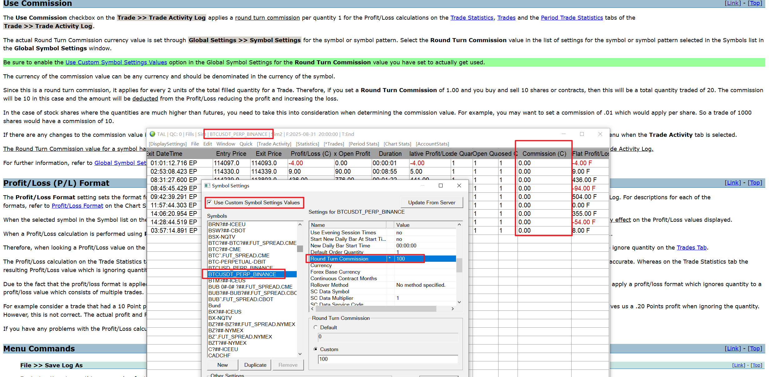 you can see in the pic,my symbol is "BTCUSDT_PERP_BINANCE" , I set the commissions=100 And I enable "Use Custom Symbol Settings Values" , final I select "Edit >> Refresh Log" , But the commissions still 0 in "Trade Activity Log" ,Help Me |