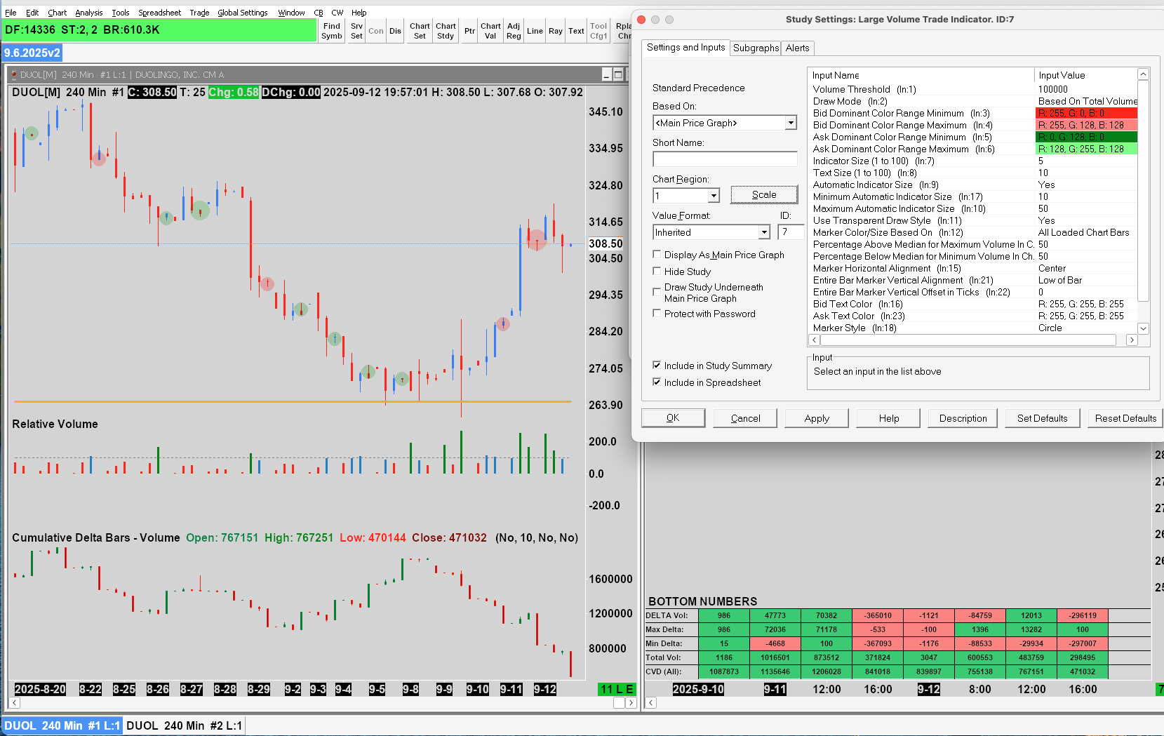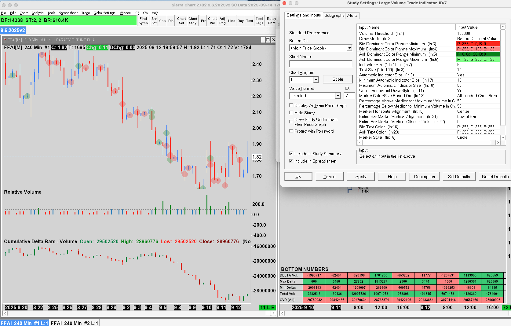 There is not a built-in way in Sierra Chart to have the "Large Volume Trade Indicator" change the "Volume Threshold" based on some outside information. To do what you want, you would have to create a custom study. Refer to the following: ACSIL Interface Members - Functions: sc.SetChartStudyInputInt() https://www.sierrachart.com/index.php?page=doc/SierraChartStudyAndSystemProgrammers.php For the most reliable, advanced, and zero cost futures order routing, use the Teton service: Sierra Chart Teton Futures Order Routing |