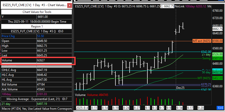 To begin with, you need to look at the Daily volume, not the intraday volume. Second, in order to see where the rollover is occurring, use a standard candlestick chart and enable the option for "Chart >> Show Rollover Dates". This will show the date at which the rollover is occurring. We have attached 2 images. One is daily charts of ESU25 and ESZ25 showing the volumes in the second region as text. It shows that the daily volume of ESZ25 is greater than the daily volume of ESU25 on September 15, 2025. The other image shows a bar chart for ESZ25 set to Continuous Volume Based Rollover with the rollover date showing in the chart. It shows the rollover on the evening of September 14, 2025, which is the trading date for September 15, 2025. Everything is showing fine for these charts for us, so we need more information on where the problem is. For the most reliable, advanced, and zero cost futures order routing, use the Teton service: Sierra Chart Teton Futures Order Routing |