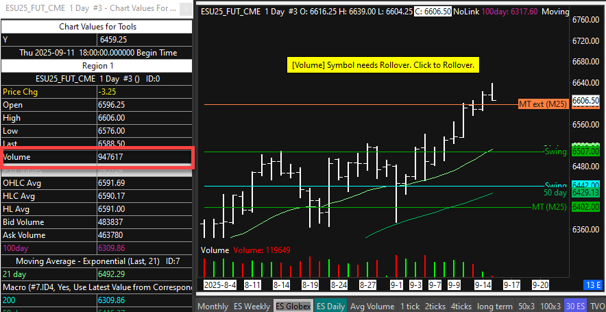 My charts are not reflecting the correct data for ES on 9/12/25. The Volume Based Roll settings are showing ESZ25 on 9/12 w/ 81k contracts traded, when ESU25 was the front month at this time, 824k traded this day in the pit session. This is incorrectly reflecting the roll, how can I fix this? Attached are graphics of the error.