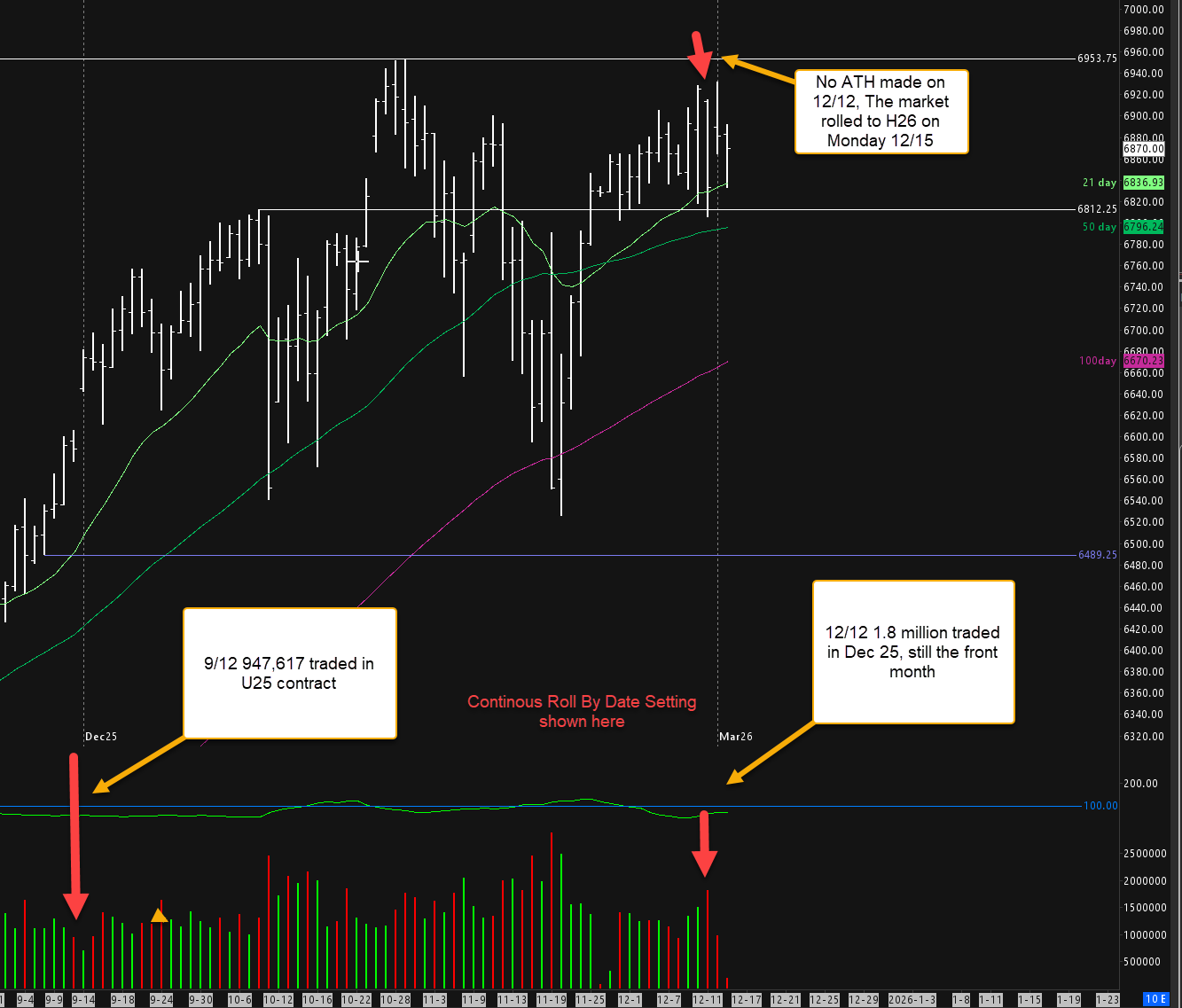 This charting issue is occuring again for the Dec to March roll. Volume based roll is not charting accurately. Today we rolled to March, but the platform is showing March as the front month on last Friday 12/12/25, showing an Incorrect high. The platform should show Dec as the front month on Friday and not March when using the Volume based roll setting. This problem is still persisting.