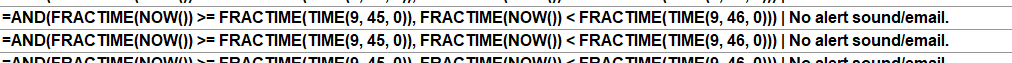 Hello SC Team, - I'm trying to avoid using ASCIL so the below is kind of out sc.CurrentSystemDateTime - The below alert is also out since I use range bars and I don't really want to use additional charts (i.e 1m/5m for this to work) =AND(BARTIME >= TIME(9, 45, 0), BARTIME <= TIME(9, 45, 59)) - So I tried this: =AND(FRACTIME(NOW()) >= FRACTIME(TIME(9, 45, 0)), FRACTIME(NOW()) < FRACTIME(TIME(9, 46, 0)))