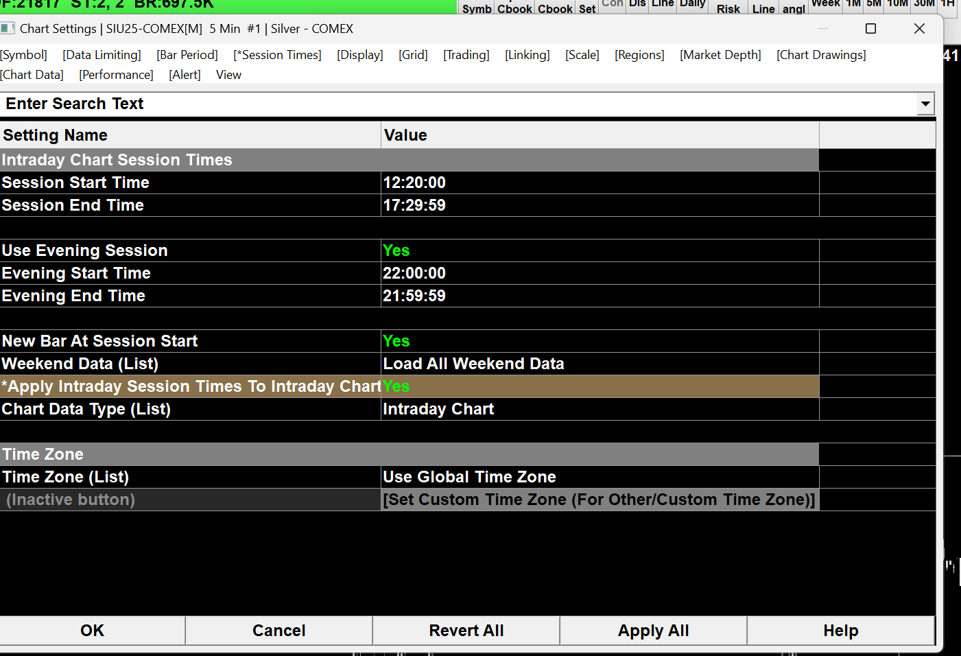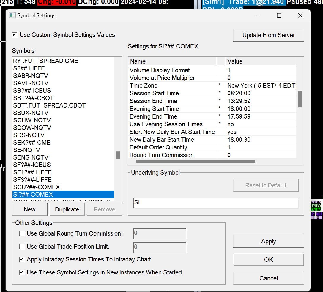 This should work. Here are the things to check: - On the Symbol Settings window is the option for "Use Custom Symbol Settings Values" enabled (is there a checkmark next to this option)? Refer to the following: Global Symbol Settings: Use Custom Symbol Settings Values (Global Settings >> Symbol Settings) - When you modified the Session Times for a particular symbol, did you enter the times relative to the "Time Zone" that is set in the Symbol Settings? That Time Zone setting is only there to establish the time zone for the Session Times that are entered. Refer to the following: Global Symbol Settings: Time Zone For the most reliable, advanced, and zero cost futures order routing, use the Teton service: Sierra Chart Teton Futures Order Routing |