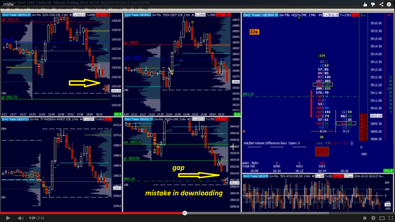 hi, sometimes, when i connect sierra chart, there are problem with downloading correct data from the market, so that i have a gap in my datas (which is acctually not there in the market - it is a mistake of the platform). i understand that when sierra chart is offline, there are all zeros on numbes bar, it is ok, what i dont understand is WHY there is a hole in my price actions and thus also in my volume profile indicators. see the video from yesterday - https://www.youtube.com/watch?v=JjLh9YZXMAU&feature=youtu.be i am sure it should not be like this, and it is a big problem for me, because i use volume for my trading a lot and i dont know how to get the real data into my volume profile when this happens. this is definately not a problem o broker/datafeed because it didnt happened on all 4 markets, only on two of the (nq, es) viz this video why does this happened and WHAT i should do to re-dowload the correnct data when this happens please? Date Time Of Last Edit: 2014-10-11 10:05:38