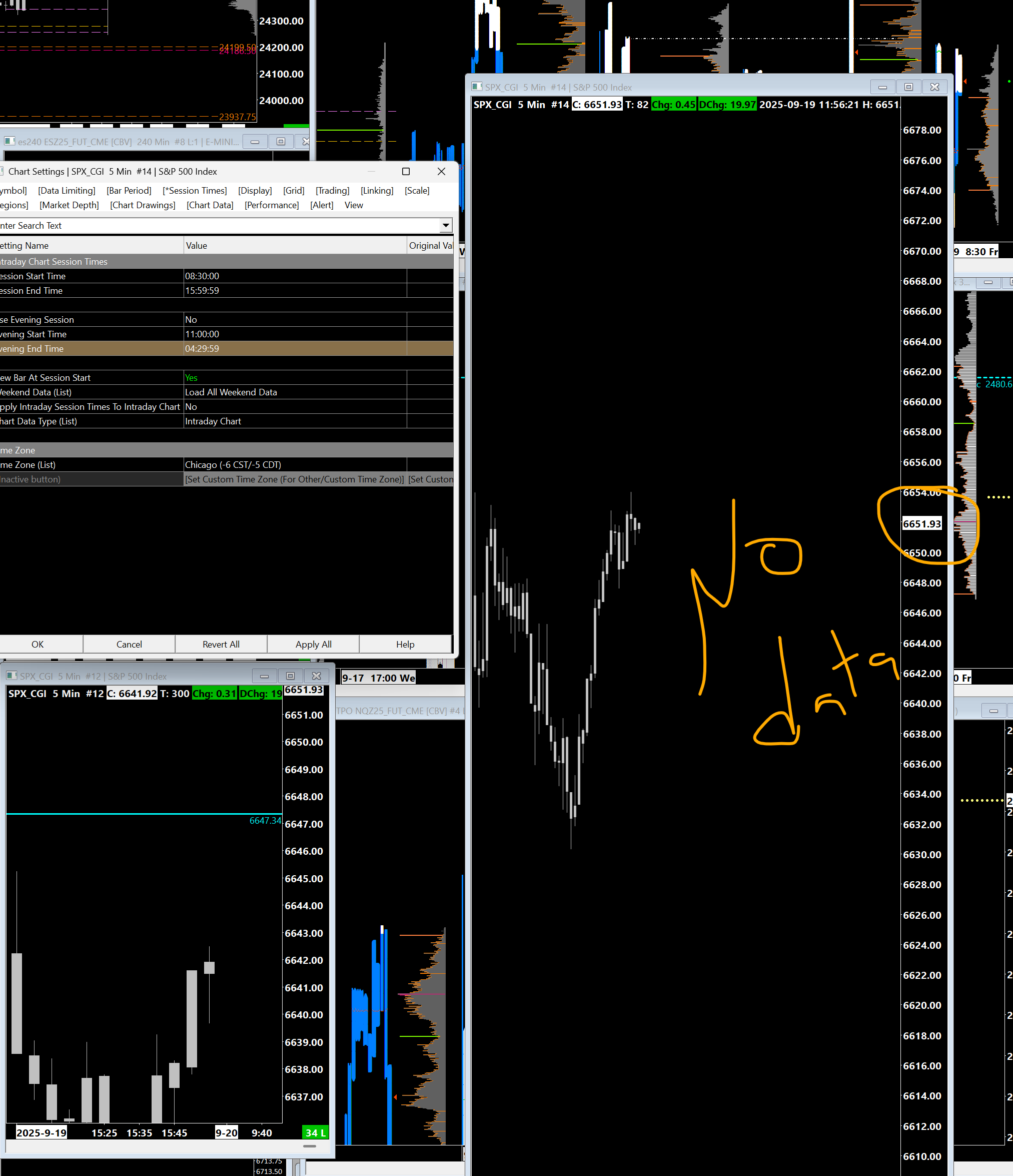 We can not see the time scale for chart #14, which is the one for which you show the Session Times. So we can not say what might be going on. We need to be able to see the time scale to know where the bars are located. We do notice that the Session Times for chart #14 are set from 08:30:00 to 15:59:59 with no evening session. The chart in the bottom left shows data for today up until 16:00:00, so if that chart has the same Session Times, then that would be why it is no longer showing any additional data. It must have a different time zone from the other chart. For the most reliable, advanced, and zero cost futures order routing, use the Teton service: Sierra Chart Teton Futures Order Routing |