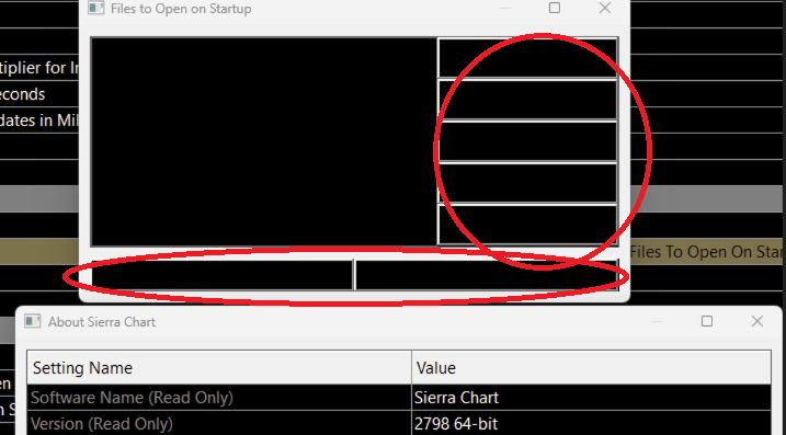 "Files to Open on Startup" buttons are blank in Version 2798 They work to click but are blank with no description. Windows 11, 64-bit, Home Version They have button labels in the prior build 2789. Not a big deal to me, but it is a minor bug. https://www.sierrachart.com/Download.php?Folder=SupportBoard&download=127369 |