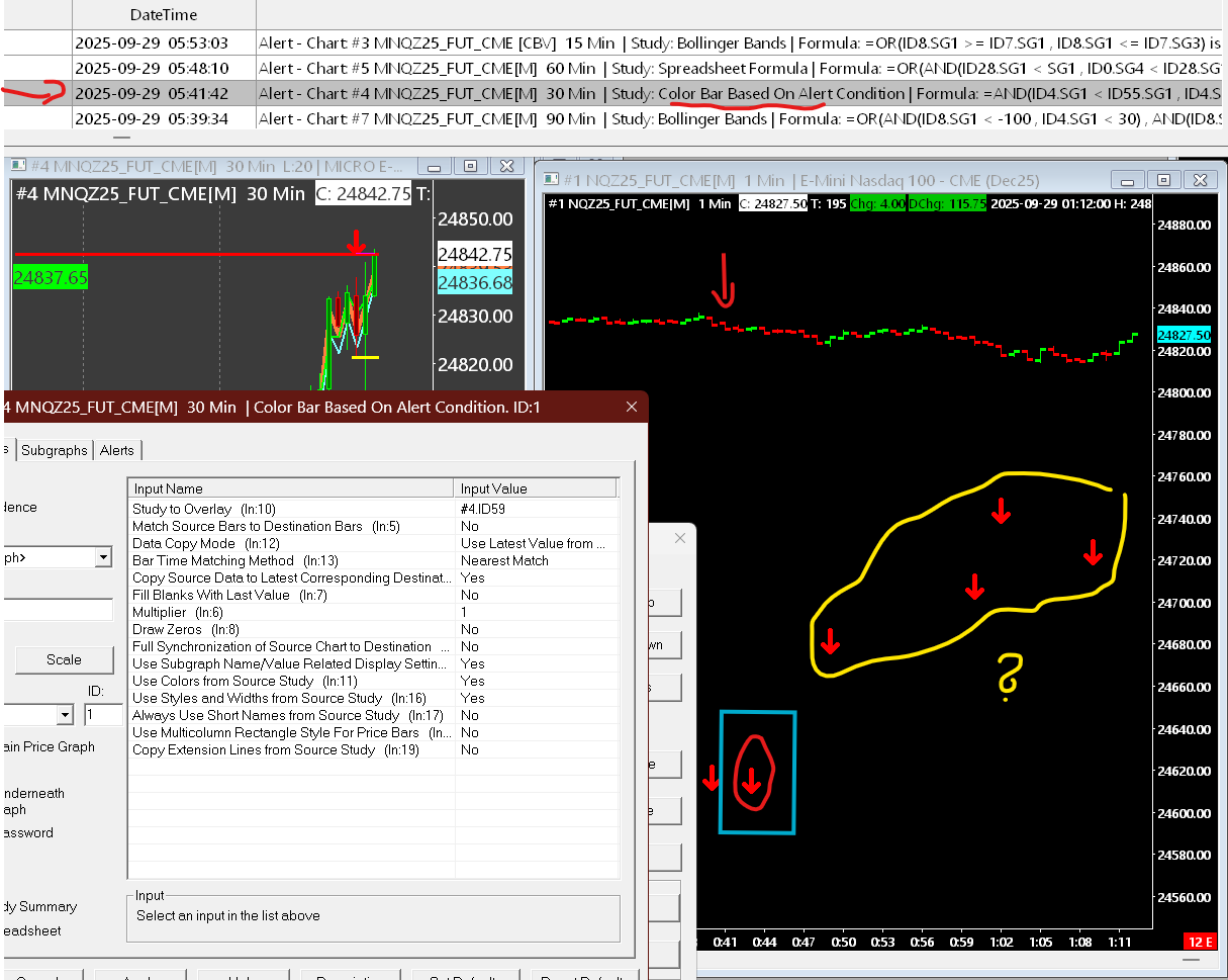 Hello Trying to get the "Color bar based on alert condition" from Chart #4 (shown as Down Red Arrows) to Chart #1 using (what I think is the right study for) "study/chart overlay". The "Color bar based on alert condition" (ID59 in chart #4) is set to trigger intra-bar when the condition is met (so it might disappear and reappear as long as conditions are there by the end of the 30 min bar and trigger multiple times). I would like to see that red arrow from chart #4 as it appears on the corresponding 1 minute bar in chart #1. The puzzle to be solved with the right combination of multiple inputs in the settings of the study/chart overlay (shown in the screenshot) is to complex to understand, and reading though your confusing descriptions of this indicator didnt help either. As seen in the screen shot not only I dont get the red arrow on chart #1 on top of the correct 1 min bar, but I also have multiple red arrows all over making ZERO sense. Please provide the right inputs for EVERY thing in the settings of the study/chart overlay in chart #1 so that Ill see ONLY the CORRECT arrow on the top of the CORRECT 1 min bar at which the last time the conditions wer met on chart #4 (as the time stamp shows the last trigger from chart #4). The time stamp is shown on the top left of the screenshot and the corresponding bar in chart #1 is market with a cyan rectangle. All other red arrows should not be there. Date Time Of Last Edit: 2025-09-29 07:06:53