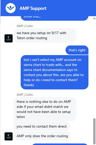 Hello, I have sierra chart package 11 with Teton order routing and an AMP funded account. On Sierra chart I'm unable to see/trade my AMP account. In the trade window I used to be able to select the AMP account number, as well as e.g. sim1. I followed the advice on Basic Trading and the Trade Window: Main/C >> Trade Account (Selecting Trade Account for Chart / Trade DOM) which says: "When Sierra Chart is connected to your Trading service account, if the available Trade Accounts you expect to see are not listed in the Trade Account list box, then contact your trading service about this. If they add an account, you will need to reconnect to the data feed to see it listed in the list of Trade Accounts." I contacted AMP and they said it was something I should contact you about (see attached image). Apologies if I'm doing something dumb inadvertently |