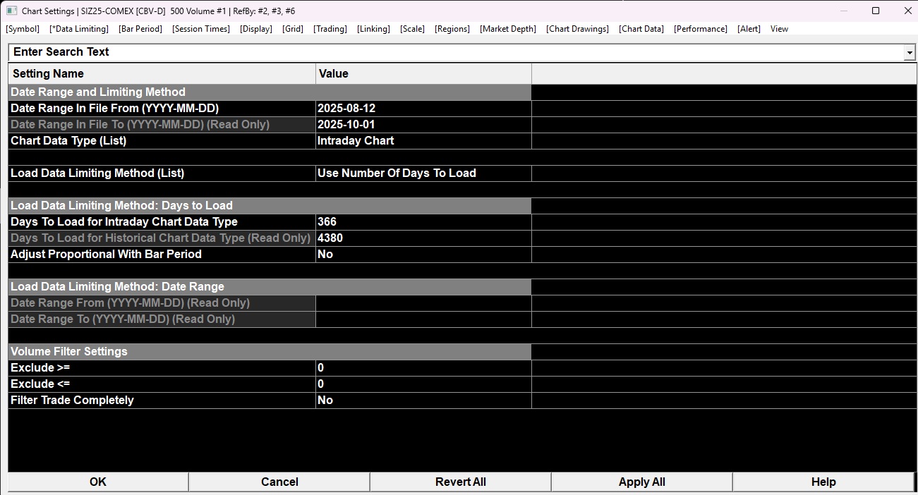 Hello, unfortunately now that I've switched my current selected service to Teton, my charts no longer load the required historical intraday data. I have my chart settings set up to load 366 days of data, but it only goes back as far as the 12th August of this year. I have the continuous contact settings as per the attached picture. This is the case with 8 chartbooks across 2 instances of SC. Any advice would be appreciated. Thanks :) |