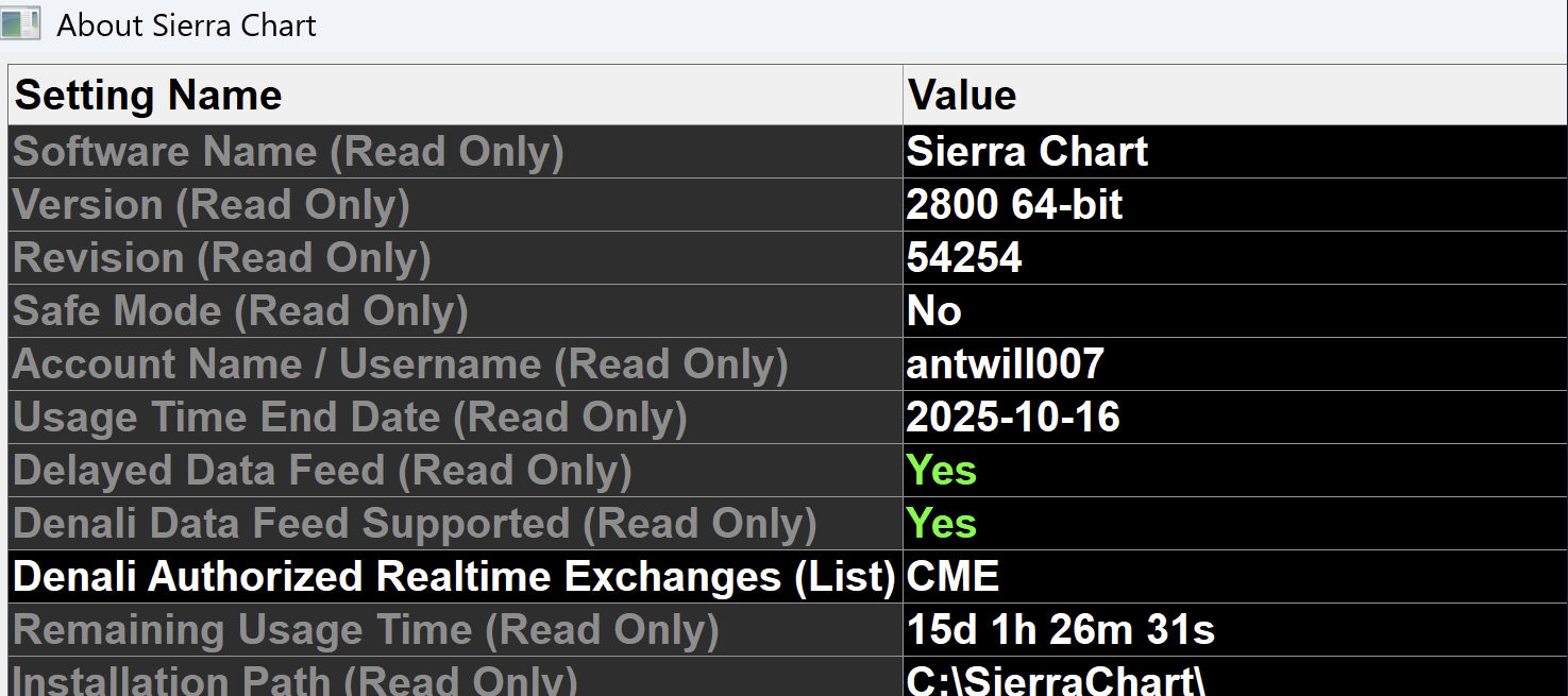 Hello, Im having issues with MBO data. I have done everything that was asked to do in the instructions. Is my account currently authorized for CME Market Depth with Market By Order Data? If not, please either: Switch my activation from the $13 CME Market Depth to the correct CME with Market Depth + Market By Order Data, or Provide explicit instructions for me to deactivate the current CME depth and re-activate the MBO version. I need explicit confirmation because my ACSIL studies depend on GetBidMarketLimitOrdersForPrice() returning per-order rows, and currently it is not functional. My account (antwill007) has: Service Package 12 (Integrated Advanced MBO) Denali Data Feed active CME Exchange Agreements signed However, my Sierra Chart “Help → About” window does not show: "Market By Order Data: Yes" And my ACSIL studies using sc.GetBidMarketLimitOrdersForPrice() and sc.GetAskMarketLimitOrdersForPrice() return 0 orders at all levels. Thank you for your assistance. |