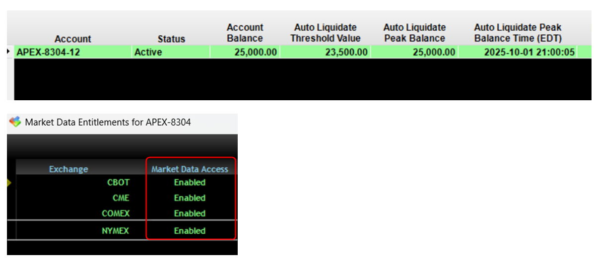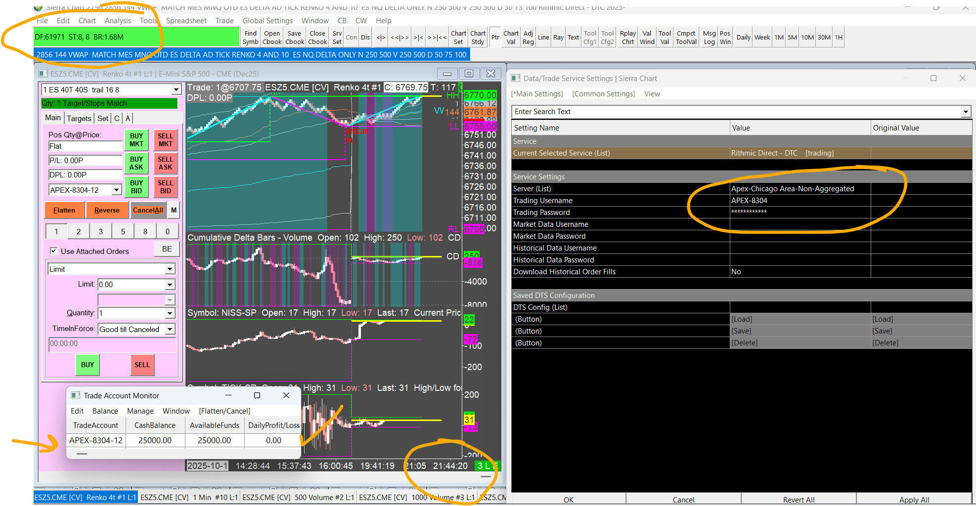 The exchange that you had active with our Denali Exchange Data Feed for the CME Group in September, did not automatically renew on October 1, 2025, due to insufficient funds in your account on that day. We see that you have added funds to your account, but that was after the check to renew the exchanges. That check occurs around 00:15:00 UTC time on the first day of each month. And since you do not have the Username/Password entered in the Data/Trade Service Settings for Rithmic, you will not get any data from them. You need to activate the exchange(s) for which you want real-time data at the following link: https://www.sierrachart.com/UserControlPanel.php?page=DenaliDataFeed#Exchanges For the most reliable, advanced, and zero cost futures order routing, use the Teton service: Sierra Chart Teton Futures Order Routing |